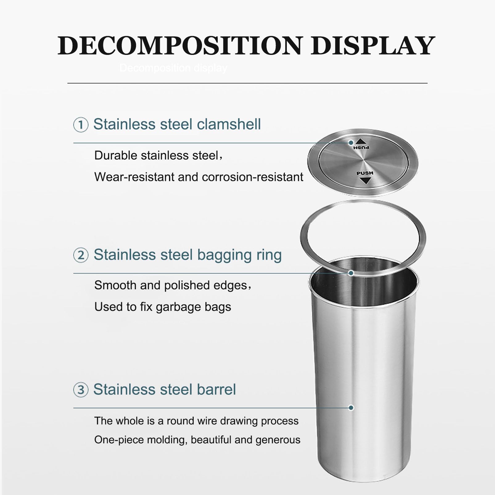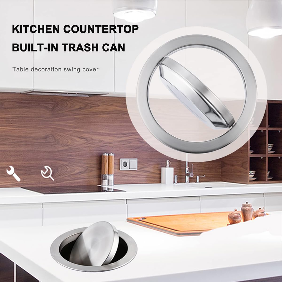 Matériau : acier inoxydable de haute qualité Lieux applicables : hôtels, bureaux, magasins, maisons privées Taille : veuillez vous référer à l'image pour les dimensions exactes Nos fonctions en un clin d'œil : Matériau en acier inoxydable résistant aux rayures et facile à nettoyer. Sirxlevcy Couvercle en acier inoxydable pour poubelle - Couvercle d'évier - Balançoire intégrée - Couvercle pour le plan de travail de cuisine C. 29,00 - Design propre et lisse pour la qualité et l'esthétique. Il suffit d'ouvrir le trou dans le bureau et d'insérer la poubelle. Le couvercle lumineux de haute qualité s'adapte parfaitement à la décoration intérieure de la cuisine, du restaurant, de l'épicerie ou du service alimentaire. Solution Rangement Déchets Discret Couvercle De Poubelle En Acier Inoxydable Intégré à Rabat D'Équilibre Fermeture Automatique Silencieuse Résistant à la rouille et à l'usure pour une luminosité durable. Solution peu encombrante pour placards, bureaux et lavabos. Mise à niveau élégante de l'espace : cachez les poubelles dans les armoires de cuisine pour une apparence propre et bien rangée. Secouez et scellez silencieusement grâce au couvercle escamotable. Poubelle encastrable - pour plan de travail de cuisine - 6L - Recycle EMUCA Installation facile : poubelle hygiénique pour plan de travail. Type de produit: Poubelle ; Référence: AX8911E ; Matériaux: En inox 304 (18/10) ; Hygiène, propreté: Bactériostatique ; Finition: Brossé Poli Satiné HyperPolish