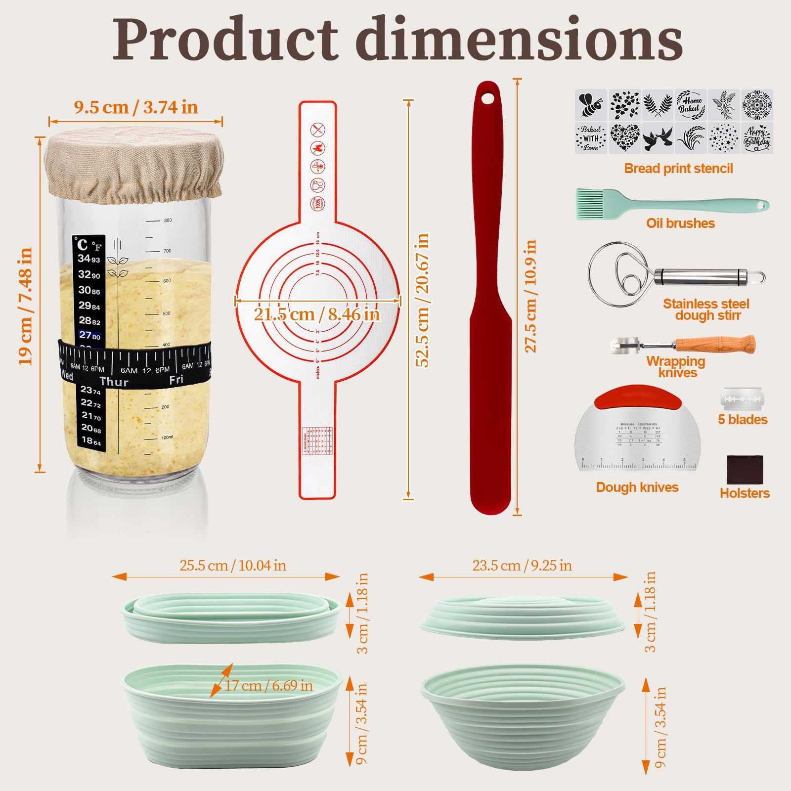 Banneton Boulangerie Kit De Cuisson De Pain De Pâte De Panier De Levure De Canne Naturel 21 Pain Maison Panier Fermentation Silicone Kit Paniers Fermentation Silicone BIGP - Rond Et Ovale + Accessoires Pain - Pour Boulangerie Maison - Résistant à La Chaleur 450°F Accessoires Boulangerie Maison Pâtisserie C'est un excellent cadeau idéal pour les amateurs de boulangerie, également idéal pour la fête des mères, Noël et Thanksgiving Gagnez du temps pour l'achat d'autres outils de cuisson du pain. Résistant à la chaleur, peut être placé directement au four ou au micro-ondes, faites cuire le pain pour une meilleure forme Contient : panier de fermentation rond (25 cm, corde en coton), 1 pot à levain (710 ml), 2 chiffons de couverture et de lin, 1 fouet, 1 lame à pain avec 5 lames, 1 grattoir en métal, 1 élingue en silicone, 1 pinceau à pâtisserie, 1 spatule en silicone Sûr et facile à nettoyer : tous nos kits de démarrage au levain sont très faciles à nettoyer et évitent ainsi l'odeur désagréable causée par les paniers traditionnels qui ne peuvent pas être nettoyés. Contenu ultra-complet : Panier banneton rond 25,4 cm, pot à levain avec thermomètre, lame à pain avec 5 lames, fouet à pâte danois, grattoir métal, brosse... 【Let's start making bread! Kit de démarrage en silicone : panier à pain pliable en silicone pour économiser de l'espace, les deux sont fabriqués en silicone de qualité alimentaire, les matériaux peuvent être utilisés pour mettre des fruits et des légumes.