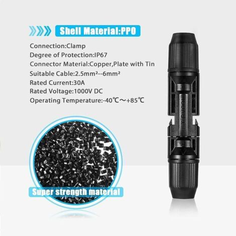 Spécifications: Nom du produit : connecteur : bouchon anti-poussière, Matériau : silicone Étanchéité professionnelle IP67 : l'anneau étanche sur le connecteur est parfait pour sceller l'eau et la poussière. Les connecteurs photovoltaïques étanches à l'eau et à la poussière peuvent être utilisés à l'extérieur dans différentes conditions météorologiques Degré d’étanchéité : IP67 【Caractéristiques de sécurité】Équipé de pièces isolantes pour éviter les chocs électriques, ce bouchon anti-poussière offre une protection et une sécurité supplémentaires en prévenant les risques électriques, assurant ainsi la tranquillité d’esprit lors de l’utilisation. 【Utilisation polyvalente】Idéal pour une gamme d’applications d’énergie solaire, ce bouchon anti-poussière est parfaitement adapté à une utilisation avec des panneaux solaires, des onduleurs, des câbles et d’autres accessoires et connecteurs solaires pertinents, ce qui en fait un composant crucial pour votre installation solaire. Bouchon Anti Poussière Solaire Connecteur Solaires 10 Paires - PV Connecteurs Mâle & Femelle Pour Panneau Solaire Ip67 Etanche Avec Cables Solaires De 4mm2 6mm2 Connecteurs Photovoltaiques Pour Installation Solaire 88846798 Connecteur étanche IP67 MC4 Classement au feu : UL94-VO 【Durabilité supérieure】Fabriqué à partir de silicone de haute qualité, notre bouchon anti-poussière présente une résistance élevée à la chaleur et un faible indice d’inflammabilité. Il s’installe en douceur avec un minimum de force et reste solidement en place, éliminant ainsi les craintes qu’il ne se détache ou ne tombe. Température ambiante : -40°C-+85°C Lot de 5 connecteurs de panneau solaire PV mâle/femelle 10 A - Diode intégrée - Connecteurs étanches et anti-refoulement Liste de colisage: 10 paires x connecteurs anti-poussière 10 paires de connecteurs solaires avec 2 outils, prise solaire mâle...
