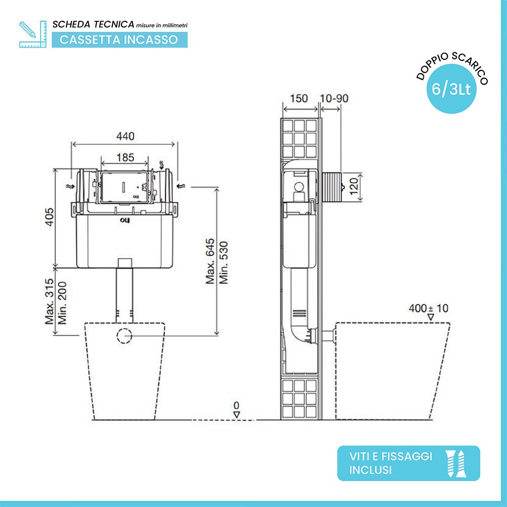Mécanisme double débit réservoir WC encastré ALLIA, Regiplast 650 / 750 Réservoir à Encastrer FUTURA 74 à Commande Mécanique Simple Et Double Debit Regiplast 43273679 Réservoir à encastrer compatible Eurofutura 600, 620 et 630 Déclenchement frontal mécanique simple ou double débit Chasse réglable : 3/6 L ou 3,5/7 L Isolation anti-condensation pour éviter l'humidité Livré complet Réservoir à encastrer pour WC, à commande mécanique avec double chasse de 3/6 L ou 3,5/7 L. Ce modèle est conçu pour une installation murale encastrée et offre un accès facile au mécanisme via une trappe de visite
