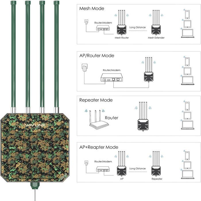 WiFi Dual Band 2.4G 5.8G ZENVY Répéteur WiFi 6 Extérieur/Amplificateur Puissant Longue Point D'accès WiFi 6 Des Fermes, jardins tentaculaires aux lieux extérieurs animés, profitez d'une connectivité transparente qui résiste à l'épreuve du temps. Il prend en charge de nombreux modes, incluant le mode Routeur, le mode Point d'Accès (AP), et le mode Répéteur, ce qui lui permet de s'adapter facilement à une multitude de scénarios extérieurs. 【Point d'Accès WiFi 6 Ultra-Rapide】Ce point d'accès conforme IP67 étanche/anti-poussière et protection électrostatique 15KV, il résiste aux intempéries (-40℃~+60℃). 【Options d'alimentation flexibles】Voici la reformulation de votre texte, sans changer les mots ni la forme : --- Renforcez votre configuration réseau extérieure avec le **support PoE (Power over Ethernet) en option**. Remarque : Utilisez un câble CAT5E ou supérieur dans une portée de 100m/328ft. Vous pouvez désormais déployer votre point d'accès même dans des zones sans accès direct aux prises électriques. Dites adieu aux zones mortes : il assure une connectivité fiable dans tous les environs. ZENVYAX3000, un routeur extérieur 100 Mètres / 200 devices, un point d'accès et un répéteur puissants conçus pour prospérer dans les environnements extérieurs difficiles. 10 Meilleures Offres Repeteur Wifi 6 Exterieur - décembre 2025 Fabriqué avec un boîtier robuste résistant aux intempéries et renforcé avec une protection ESD de 15 KV et IP67 , cet appareil garantit un fonctionnement ininterrompu et une connectivité inébranlable même dans des conditions météorologiques difficiles. Augmentez la portée du WiFi avec Repeteur Wifi : Boostez le signal de votre modem WiFi existant jusqu'aux zones difficiles d'accès avec ce Repeteur Wifi. Il élargit votre couverture sans fil jusqu'à 1200㎡ avec le WiFi bi-bande Idéal pour le streaming HD et le jeu fluide, il exploite une puissance de transmission de <20 dBm (2,4 GHz, EIRP) et <28 dBm (5 GHz, EIRP) pour des connexions stables. Équipé de 5 antennes robustes omnidirectionnelles en fibre de verre de 8 dBi, le ZENVYAX3000 offre une résistance, une précision et une longévité exceptionnelles, offrant des performances sans fil exceptionnelles dans de vastes espaces extérieurs. De plus, sa conception robuste avec un boîtier étanche IP67, une protection contre les décharges électrostatiques de 15 kV et une protection contre la foudre de 6 kV garantissent une performance fiable et continu Que vous organisiez des événements en plein air, que vous gériez des postes de travail à distance ou que vous recherchiez simplement une connectivité fiable dans des environnements extérieurs difficiles, faites confiance au ZENVYAX3000 pour fournir un WiFi6 ultra-rapide à tout moment, n'importe où. Connectez-vous en toute confiance car cet appareil peut accueillir jusqu'à 200 appareils simultanément, étendant la couverture à un plus large éventail d'utilisateurs sans compromettre les performances. Remarque : ne prend pas en charge les fréquences DFS. Connectivité fluide, n'importe où]Doté de quatre antennes tubulaires omnidirectionnelles en fibre de verre 8dBi et de deux amplificateurs haute puissance intégrés, ce point d'accès offre une couverture WiFi et une pénétration inégalées Exploitant la puissance des normes PoE power supply IEEE 802., 3af/at, ce point d'accès extérieur offre des vitesses Internet ultra-rapides allant jusqu'à 3000 Mbps. 【Modes polyvalents pour chaque besoin】Que vous soyez en camping ou que vous étendiez la couverture de votre réseau dans un environnement urbain dense, cet appareil est idéal.