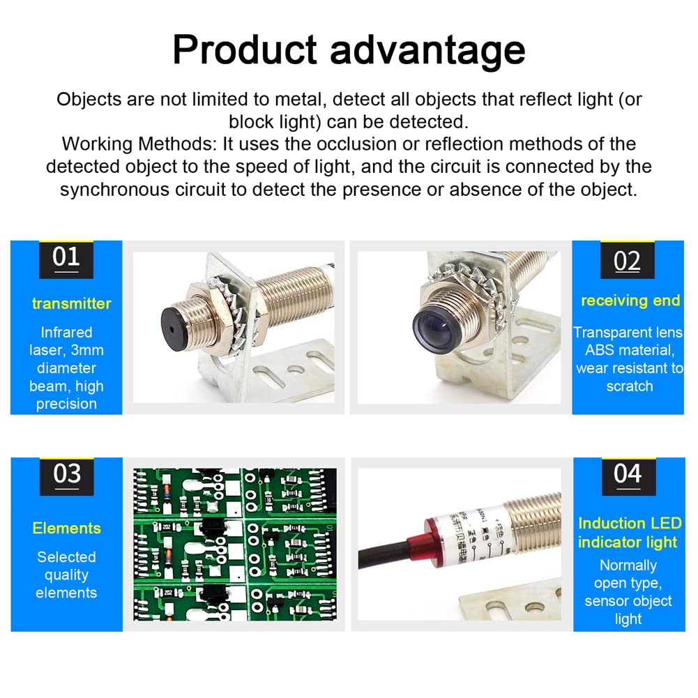 Les objets ne sont pas limités au métal, tous les objets qui reflètent la lumière (ou bloquent la lumière) peuvent être détectés. Diamètre du faisceau laser: Faisceau laser infrarouge de 3 mm de diamètre avec une grande précision. Voyant LED: Equipé d'un indicateur d'induction LED, de type NPN, il s'allumera lorsque l'objet d'induction Fonctionnalités : Éléments : éléments de qualité sélectionnés, haute sensibilité du capteur, avec une stabilité et une durabilité fines. Méthodes de travail : il utilise les méthodes d'occlusion ou de réflexion de l'objet détecté à la vitesse de la lumière, et le circuit est connecté par le circuit synchrone pour détecter la présence ou l'absence de l'objet. 1 pièce d'acceptation de jet Capteur Faisceau 3mm Npn 20m Dc 6-36v Détection Objet PAL Capteur Infrarouge Détecteur De Faisceau à LED, Capteur De Faisceau Capteur LED Indicateur Lentille ABS : lentille transparente en matériau ABS, résistant à l'usure, aux rayures et peut offrir une longue durée de vie. Longueur du câble : 1,5 m. Dimensions de l'article : 12 x 12 x 58 mm/0,47 x 0,47 x 2,28 pouces Dimensions de l'emballage : 205 x 180 x 20 mm / 8,07 x 7,09 x 0,79 pouces Poids du colis : 100 g Contenu : 1 pièce de démarrage à jet. Diamètre du faisceau : faisceau infrarouge de 3 mm de diamètre et haute précision. Interrupteur photoélectrique à faisceau E3F-20C1/E3F-20L, capteur de lumière Visible infrarouge (Color : PNP normal open Voyant LED : équipé d'un indicateur à induction LED de type NPN, il s'allume lorsqu'il y a un objet à induction. Cikonielf capteur de faisceau IR Détecteur de Faisceau Infrarouge...