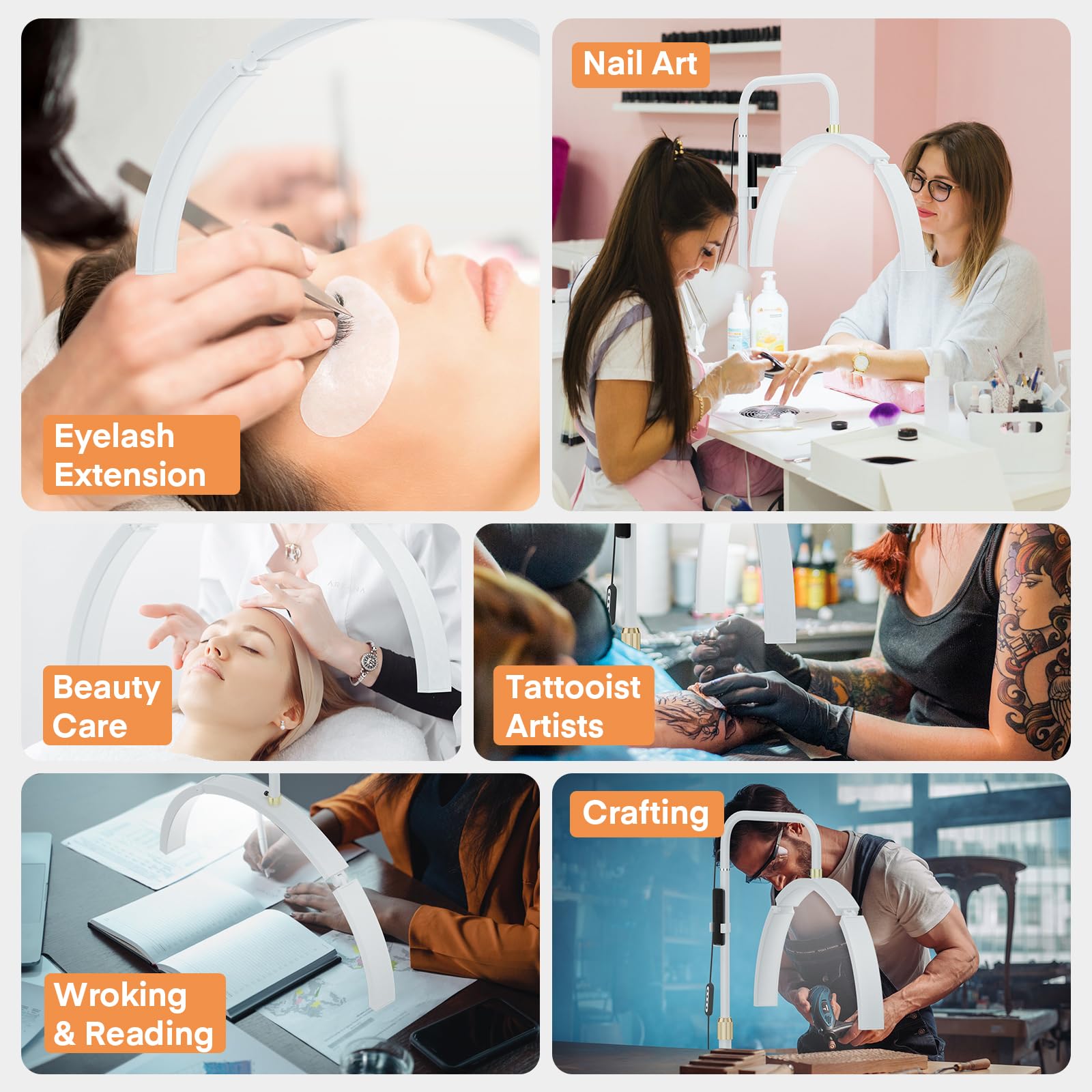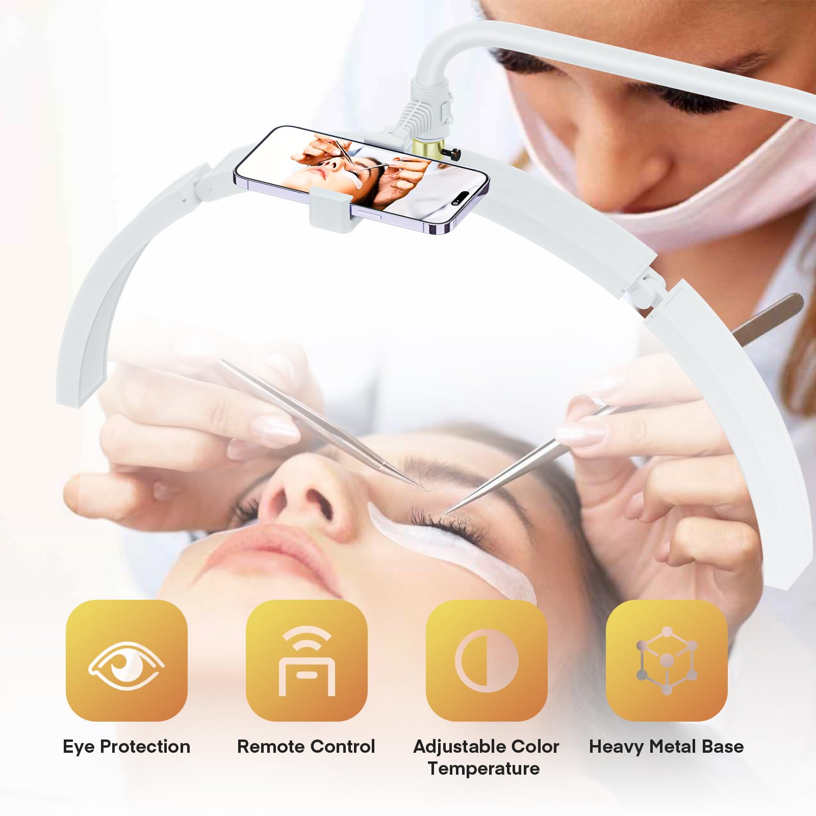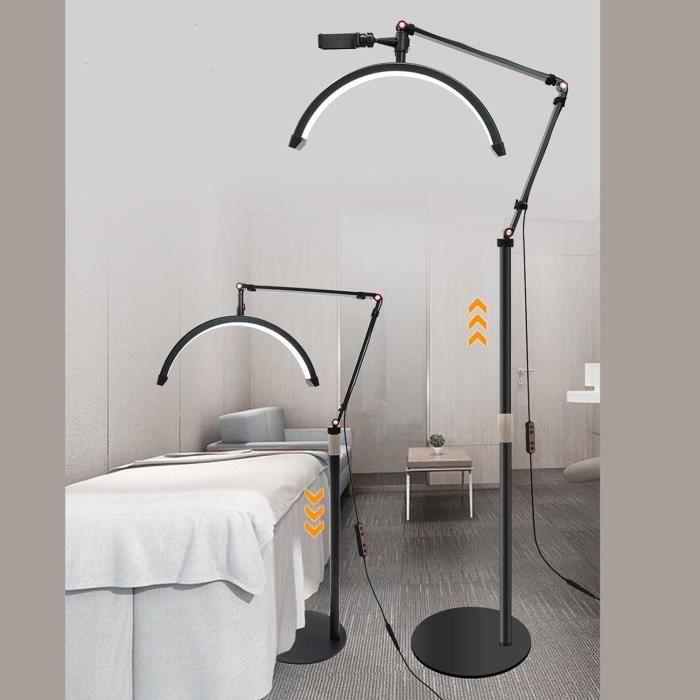 Grande lampe demi-lune avec support de téléphone : la lampe demi-lune pour ongles dispose d'un design incurvé unique qui fonctionne bien pour éliminer les ombres et couvrir complètement toute la zone de manucure Base épaisse plus solide : la lampe de beauté sur pied dispose d'une base en métal robuste et lourd qui empêche efficacement le basculement, assurant stabilité et sécurité pour vos enfants et animaux de compagnie Lampe Beauté LED Réglable Lampe Demi-lune Pliable De 73,7 Cm, Lampe De Bureau Avec Lumiere Extension De Cils Lampe demi-lune, lampe de cils LED pour extensions de cils, 73,7 cm, 3 températures de couleur, réglable en hauteur, lampe lune pour soins de la peau, tatouage, technologie de cils Gain de place et peut être placé dans des coins étroits lorsque vous ne l'utilisez pas Vous offrant plus de commodité Design pliable : la lampe de table pliable à DEL demi-lune est fabriquée en aluminium, ABS et PC, conçue pour une portabilité ultime et un gain de place. Il peut être facilement assemblé et démonté en quelques secondes, sans vis compliquées, assurant une installation rapide Les meilleures extensions de cils : le guide ultime pour 2025 Spécialement conçu pour la technologie de cils de lampe à lumière de lune, la beauté, le tatouage, les sourcils, les professionnels des soins de la peau, ainsi que pour les activités telles que la lecture, l'enfilage et les travaux manuels Installation facile : ces lampadaires sont faciles à installer, vous n'avez pas besoin d'utiliser des outils supplémentaires et ils s'installent rapidement en quelques minutes. Lampadaire LED multifonction : la lampe à cils pliable est livrée avec un support de téléphone intégré, une télécommande et un plateau de support.