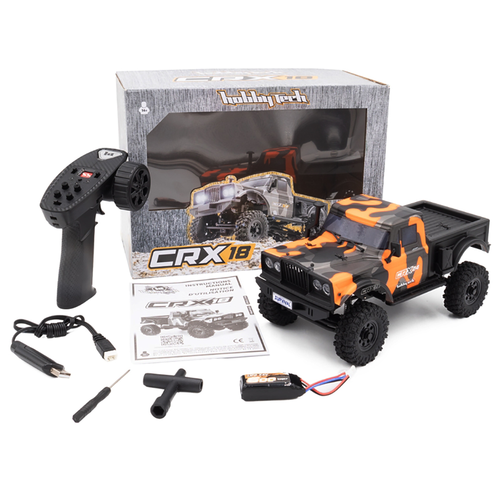 D'origine, le CRX est équipé de 2 phares à LED qu'il est possible de commander via la radiocommande. CRX18 FLAT CAGE 4WD SABLE MINI CRAWLER Nouvelle version 6 roues motrices et Flat Cage : Le CRX18 6WD flat cage reprend les caractéristiques du CRX18 mais avec 2 roues motrices supplémentaires. Sur le plan esthétique, le CRX18 est une reproduction fidèle de son grand frère. De nombreuses options seront disponibles pour améliorer les performances ou le look du C, A Charbon Petit détail sympa : les marche-pieds sont équipés d'une fente dans laquelle se loge le bas de la carrosserie pour ne pas l'endommager sur les obstacles. Il se différencie aussi par son plateau arrière équipé d'un arceau et d'une roue de secours. Mini Crawler 1/18 Hobbytech le CRX18 en version Flatcage 6WD La motorisation est confiée à un micro moteur à charbon de 55T. Le CRX18 6WD offre de nouveaux horizons et de nouvelles possibilités de roulage. Le micro servo de direction est un modèle 3 fils avec une prise standard. Hobbytech CRX18 Flat Cage 6WD OrangeNew version 6WD and Flat Cage: The CRX18 6WD flat cage retains the features of the CRX18 but with 2 additional drive wheels. The CRX18 6WD offers new horizons and new possibilities for driving. It also differs by its rear plate equipped with a roll cage and a spare wheel. Other realistic accessories also complete this model. The CRX 18 is a 1/18th scale... Crawler 1/18 Mini 6 Roues Motrices Hobbytech CRX18 Flat Cage 4WD Sable Voiture RC Crawler 1/18 ÉQUIPEMENTS:Le mini est conçu comme un scale au 1/10ème : châssis poutre en métal, boîte de transmission centrale (positionnée légèrement sur l'avant) avec un moteur en position basse et 2 ponts qui sont chacun reliés sur le châssis par 4 links.