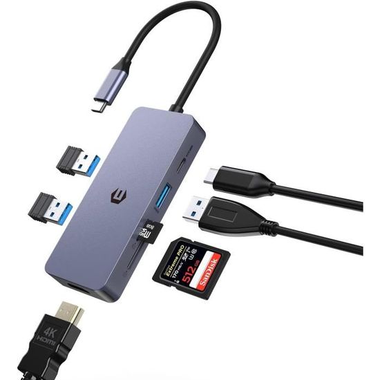 Hub USB C, Tymyp Adaptateur USB C 7 en 1- Sortie HDMI 4K/ PD 100W/ 2 USB A 3.0/1 USB C 3.0/ Lecteur de Carte SD/TF, Hub USB de Type C Compatible avec Ordinateur Portable/MacBook Pro/Pad Marque Veuillez noter : le port de chargement Type-C PD est uniquement destiné aux appareils avec protocole PD. Hub USB C 7 En 1 HDMI 4K Hub Usb C, Adaptateur Usb C 7 En 1 - Sortie Hdmi 4K- Pd 100W- 3 Usb A 3 Station D'accueil Macbook Pc Portable HDMI 4K Cet adaptateur HDMI USB-C Hub vous permet d'étendre vos ordinateurs portables USB-C à différents moniteurs. 【Lecteur de Carte USB C】 : Emplacements SD et TF intégrés, transférez des centaines de photos sur votre ordinateur portable en quelques secondes avec une vitesse maximale de 104Mo/s. 【Hub USB C vers HDMI 4K】:Mettre en miroir ou étendre l'écran des appareils de type C avec sortie HDMI vidéo 4K@30Hz vers HDTV, moniteur ou projecteur. Hub USB C, Tymyp 9 en 1 Station d'accueil Multiport Adaptateur USB C... 7 in 1 USB C Hub, Tymyp USB Adapter, 5 Gbps Data Transfer, a 【Station D'accueil USB C 7 en 1】 : Le Hub USB C fonctionne parfaitement avec les appareils portables de type C avec l'adaptateur USB-C multiport, y compris : 1 x port de charge USB Type-C, 1 x HDMI 4K, 3 x USB 3., 0 A Ports, 1 x lecteur de carte SD/Micro SD 【Transfert de Données Ultra Rapide】 : Le hub USB avec trois ports USB 3., 0, prend en charge une vitesse de transmission jusqu'à 5Gbit/s et une charge de 5V/1., 5A, ce qui est 10 fois plus rapide que l'USB 2., 0, un film HD peut être transféré en quelques secondes. Les cartes SD et Micro SD peuvent fonctionner en même temps.