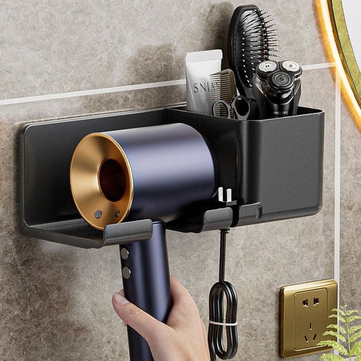 Support Hôtel Chambre Ventouse, Porte Seche Cheveux Mural Support Seche Cheveux 【Support Seche Cheveux Ventouse】Facile à installer, appuyez simplement sur la ventouse contre le mur, tournez à droite pour exclure l'air à l'intérieur, puis fixez la ventouse sans endommager le mur. Optimisez l'espace de votre salle de bains grâce à notre support à ventouses pour sèche-cheveux. Conçu pour être utilisé dans les hôtels ou les chambres à coucher, ce support mural pour sèche-cheveux offre une solution de rangement pratique et élégante pour votre équipement Découvrez notre support mural pratique pour sèche-cheveux, la solution idéale pour organiser votre salle de bain. Ce support élégant s'installe facilement sans perçage grâce à son système adhésif puissant, préservant ainsi l'intégrité de vos murs Ne laissez pas le désordre envahir votre salle de bains : optez dès maintenant pour ce support de sèche-cheveux design et pratique ! Avec cela, vous pouvez simplifier votre routine matinale et trouver plus facilement un sèche - cheveux. 1 PCS Support Mural Pour Sèche-cheveux - Diamètre : 8,5 Cm - Pour Salle De Bain Chambre A Coucher Hotel 96103825 【Cuscinetto Antigraffio in Silicone】Les coussinets en silicone sur le support de sèche-linge peuvent empêcher la surface du sèche-linge de rayer. Trlyane Support Seche Cheveux Ventouse Conçu pour être utilisé dans les hôtels ou les chambres à coucher, ce support mural pour sèche-cheveux offre une solution de rangement pratique et élégante pour votre équipement. Simple à installer, ce support de sèche-cheveux à ventouse se fixe au mur et pivote vers la droite pour se verrouiller, ce qui en fait la solution idéale pour garder votre sèche-cheveux à portée de main, tout en conservant un espace de rangement ordonné. Fabriquée à partir de matériaux durables, cette base est non seulement fonctionnelle mais aussi esthétique, avec une finition grise contemporaine qui s'intègre parfaitement à la décoration de la salle de bains. Le système d'enroulement du câble permet de ranger proprement les prises, évitant que le câble ne soit tordu ou mouillé, ce qui réduit les risques de sécurité. Nous avons une grande variété de supports de salle de bains / cuisine, espérons que nous pouvons apporter toutes sortes de commodité et de rapidité à votre vie Optimisez l'espace de votre salle de bains grâce à notre support à ventouses pour sèche-cheveux.