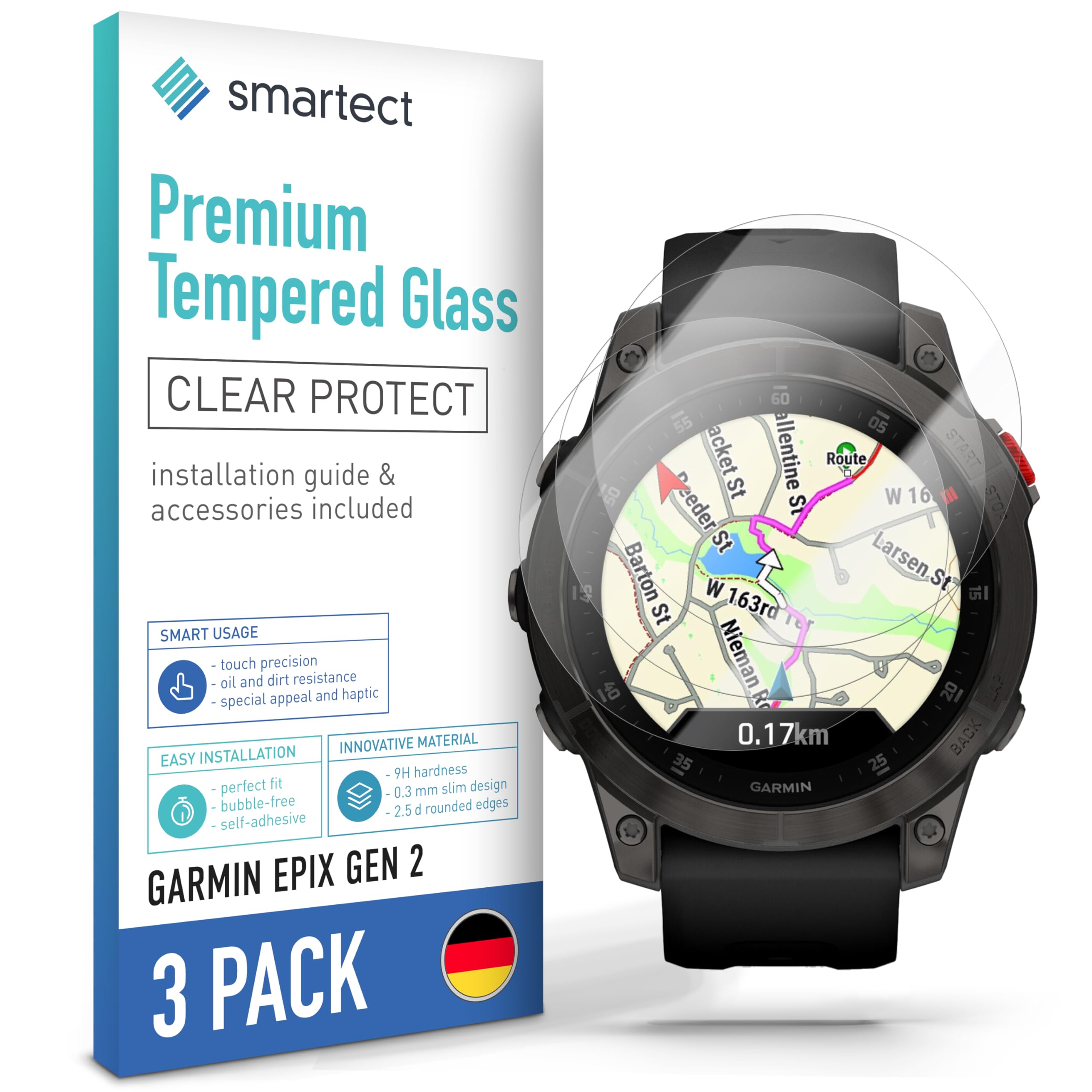 Garmin Epix Pro Gen 2 Sapphire Titane 51mm Smartect Verre Trempé [3 Pièces, Clear] Pour Garmin Forerunner 235 Epix Gen 2 Sapphire Titane LE SORTIMENT SMARTECT: Découvrez la gamme diversifiée de verres de protection d'écran smartect pour smartphones, caméras, tablets et montres. Marque. Camokia · Appareils compatibles. Montre connectée · Matériau. Verre trempé · Dureté de l'article. 9H · Dimensions du produit. 15L x 10l centimètres Le protecteur d'écran Savvies Smart Glass combine la dureté du verre trempé 9H avec un film protecteur flexible de haute technologie. Cette technologie hybride est conçue pour ceux qui recherchent une protection sans compromis : dureté 9H, sans fissuration CONTENU DE LA LIVRAISON: Le paquet comprend 3 verres de protection, 3 lingettes humides, 1 chiffon en microfibres, 2 autocollants anti-poussière, et un mode d'emploi détaillé Choisissez parmi Clear, Privacy, Matte et Full Screen HUADU Protection d'écran de montre compatible avec Garmin Si votre smartphone est courbé, seule la surface horizontale est couverte par le film de protection en verre Quelle est la différence entre un verre trempé et un film de protection TPU ? Le verre trempé est résistant aux chocs et aux rayures, et protège efficacement contre les chutes. Quelle est la résistance du verre trempé contre les chutes et les rayures ? Avec sa dureté 9H, le verre protège efficacement contre la casse, les rayures et l’usure quotidienne causée par des clés, pièces, etc. Cette protection en verre protège donc votre écran des rayures et des brisures Une vidéo explicative et des accessoires comme des lingettes nettoyantes sont inclus. AJUSTEMENT PARFAIT: Le film indestructible de smartect est 100% compatible avec Garmin Epix Pro 51mm. Tous les protecteurs smartect en verre véritable sont auto-adhésifs Dans certains cas, une nouvelle calibration ou configuration peut être nécessaire après l’installation.