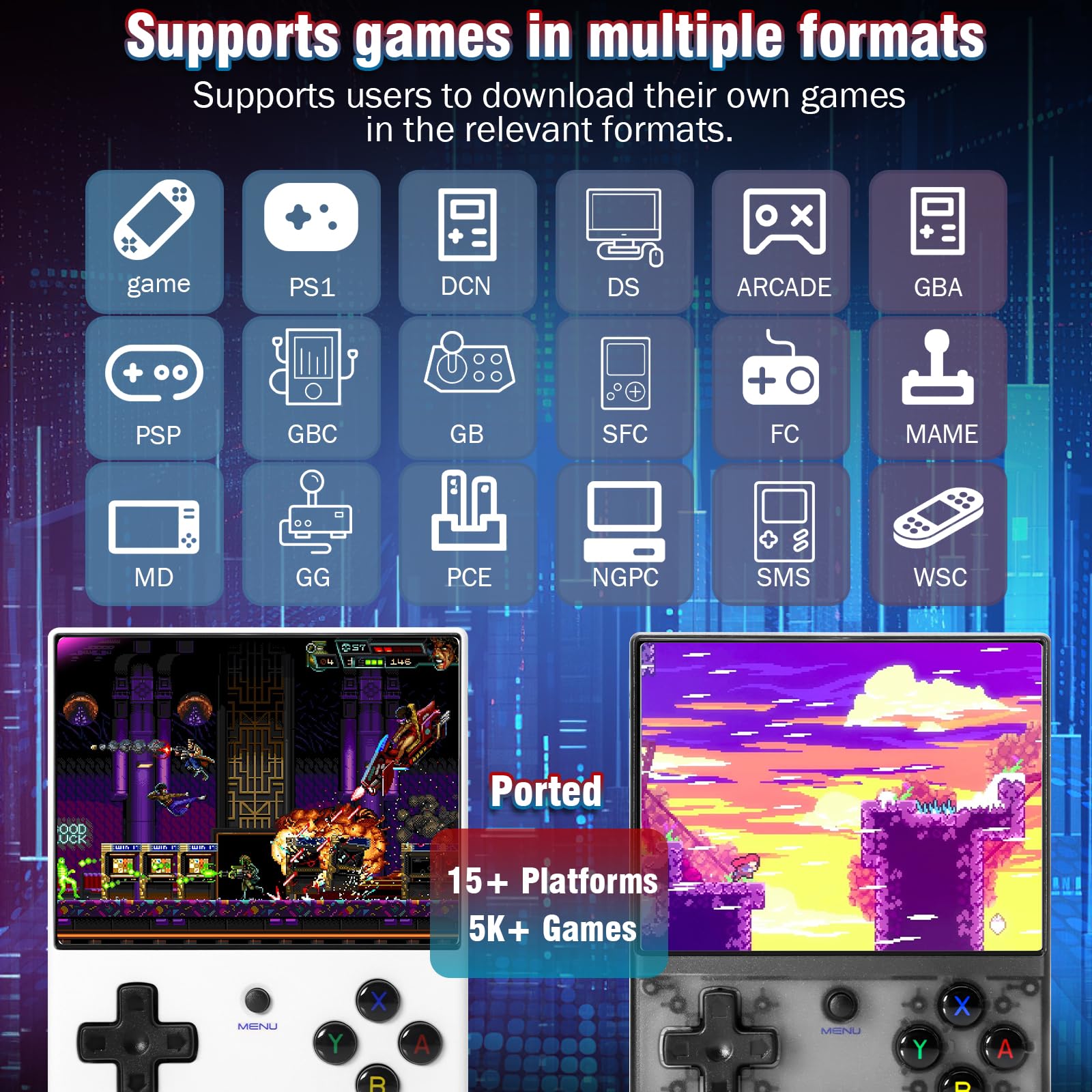 Contenu de la livraison : 1 console de jeu portable 1 câble de charge USB 1 manuel d'utilisation (français non garanti) 1 carte TF 64 Go 1 protection d'écran. Console de jeu ANBERNIC RG35XX Plus avec style Linux : RG35XX Plus est livré avec une carte TF 64 Go préchargée 5570 jeux classiques, permet aux utilisateurs de télécharger des jeux dans 15 types de formats de jeux pertinents Écran IPS de 3,5 pouces : le Gameboy rétro adopte un écran IPS de 3,5 pouces avec un angle de vision complet, entièrement laminé, avec une résolution de 640 x 480, la qualité d'image est plus claire, la couleur est plus saturée, ce qui vous apporte une merveilleuse expérience de jeu et une meilleure protection des yeux, avec verre trempé pour les protéger avec une double protection, anti-rayures et anti-chocs z de sorte que vous avez un une bonne expérience de jeu Prise en charge des utilisateurs pour télécharger des jeux dans des formats connexes. Que vous soyez à la maison ou en déplacement, vous pouvez passer un moment agréable avec votre famille. Handheld Rétro Wifi Bluetooth Sortie Hdmi RG35XX Mini Plus Console De Jeu Portable 3,5 Pouces Système Classique Console Jeu Portable Rétro Prise en charge de la sortie HDMI : le casque portable rétro prend en charge la sortie HDMI pour TV et le joystick sans fil 2,4 G et la connexion joystick filaire, prise en charge des moteurs à vibrations. Batterie de 3300 mAh : le jeu de poche dispose d'une batterie intégrée de 3300 mAh de haute capacité, qui permet un mode veille ultra long et prend en charge une charge rapide avec un câble USB de type C. Lorsqu'il est complètement chargé, il peut être utilisé jusqu'à 8 heures. Par rapport au RG35XX, le RG35XX Plus prend en charge le WiFi 2., 4/5G et le Bluetooth 4., 2, prend en charge le streaming et le sparringum en ligne WiFi pour offrir une expérience de jeu immersive et augmenter le plaisir de je Anbernic RG35XX 2024 - Écran 3,5 pouces - Gris Console de jeu portable RG35XX Plus : la carte TF RG35XX Plus Game Boy intégrée 64 Go, 5500 jeux classiques préinstallés, prend en charge PSP, PS1, DCNDS, ARCADE, DO5, MD-CDIGG, PCE, PCE-CD, NGPCSM5, W5C et d'autres formats de jeu. Effet visuel étonnant]La console rétro Game portable RG35XX Plus utilise un écran IPS de 3,5 pouces avec une résolution de 640 x 480 pour une qualité d'image plus claire et des couleurs plus riches qui donnent vie à vos jeux