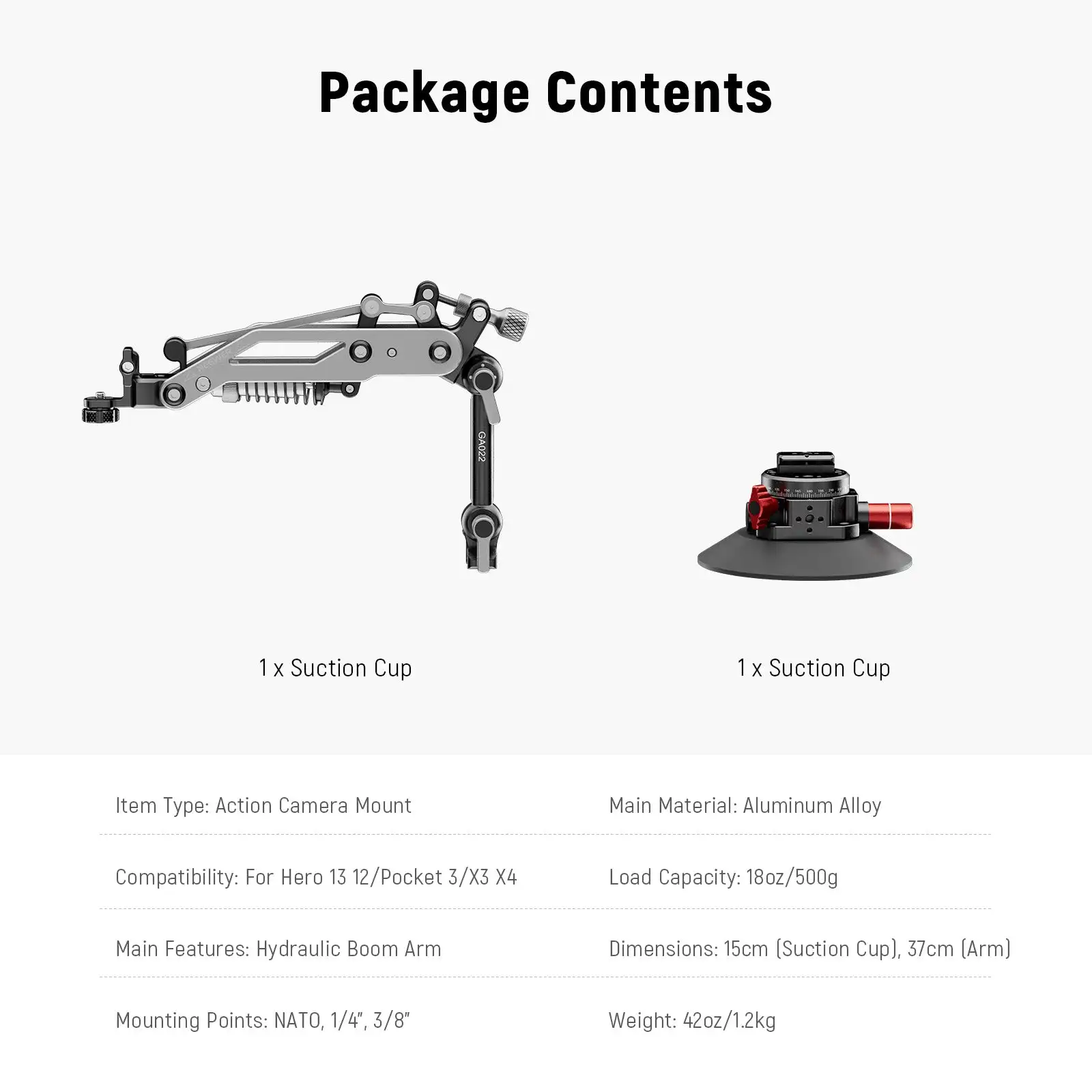 Le pied pivotant à 360° permet une rotation fluide et continue pour des prises de vue panoramiques. Le support de caméra fixe solidement votre caméra d'action (compatible avec les cames) avec trois ventouses puissantes, et permet un positionnement flexible avec des rallonges et un bras magique à tête sphérique pour l'enregistrement vidéo, avec un cordon de sécurité pour plus de sécurité Remarque : veuillez nettoyer soigneusement la ventouse et la surface de contact avant utilisation et assurez-vous que toutes les vis sont bien serrées. 【Connexion NATO à dégagement rapide】le rail NATO offre un moyen rapide et efficace de monter et de desserrer votre équipement. Pour adaptateurs de fixation compatibles avec GoPro Hero 13 Go Pro 12 11 10 9 noir et accessoires de cage de téléphone pour enregistrement vidéo POV, vlogging sur tableau de bord de voiture, pare-brise intérieur ou extérieur Bras Hydraulique NEEWER Support De Voiture à Ventouse Sous Vide Pour Caméra D'action Rail NATO Pour GoPro Deux articulations pivotantes à 180° permettent un positionnement facile et précis. Le support avec vis 1/4 et broches de fixation rétractables. Compatible avec les caméras d'action DJI Osmo Pocket 3 Creator Combo Insta360 X3 X4 X5 Insta 360 Ace Pro. Le bouton de vis arrière assure un contrepoids et donc une plus grande stabilité pendant l'utilisation. The NEEWER GA022 is a robust car suction cup mount with a La charge utile idéale pour ce bras de flèche est de 150 à 500 g Installation rapide et sûre : le support à ventouse pour téléphone portable et appareil photo dispose d'un design à un bouton et se fixe en toute sécurité à...