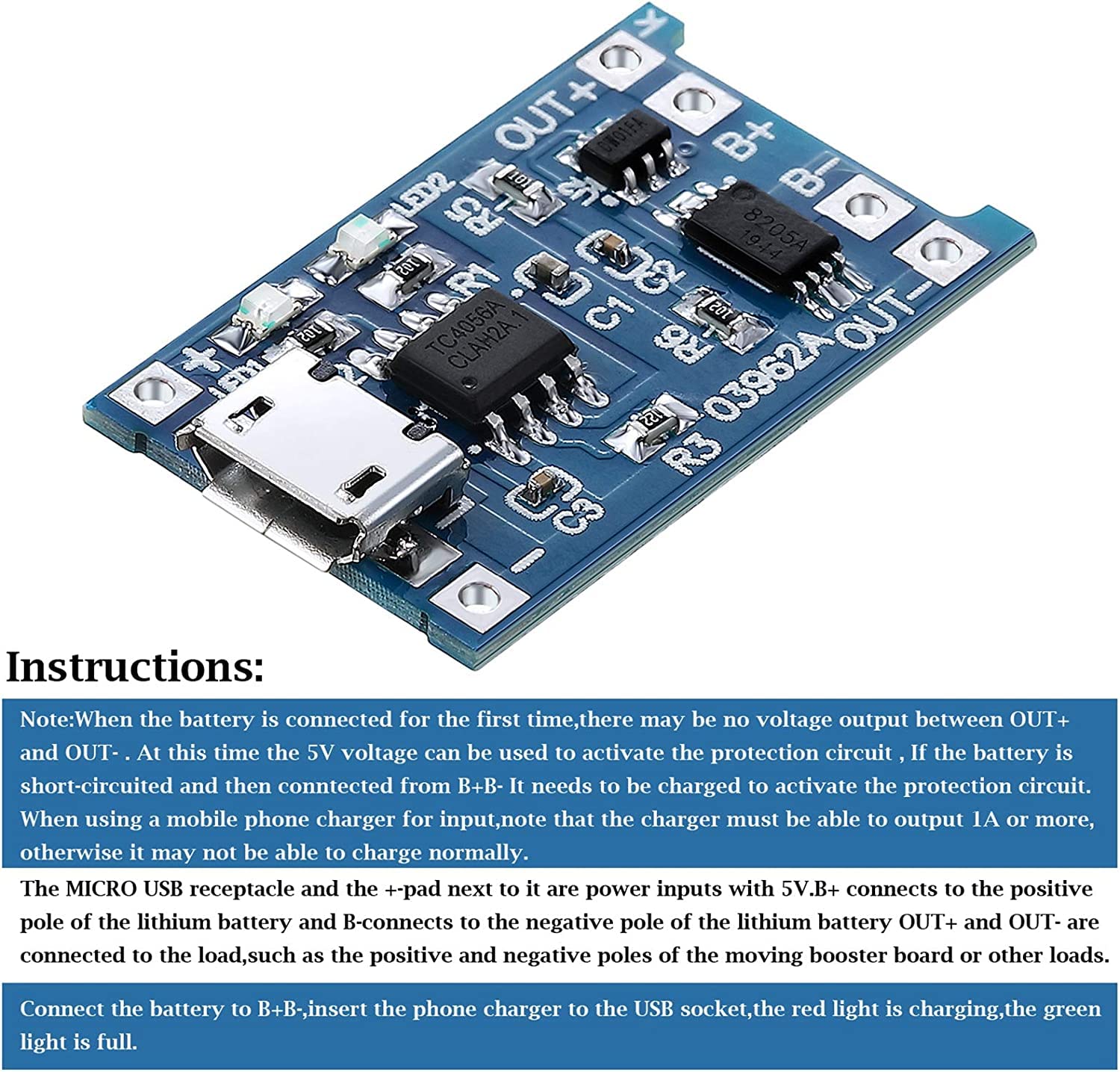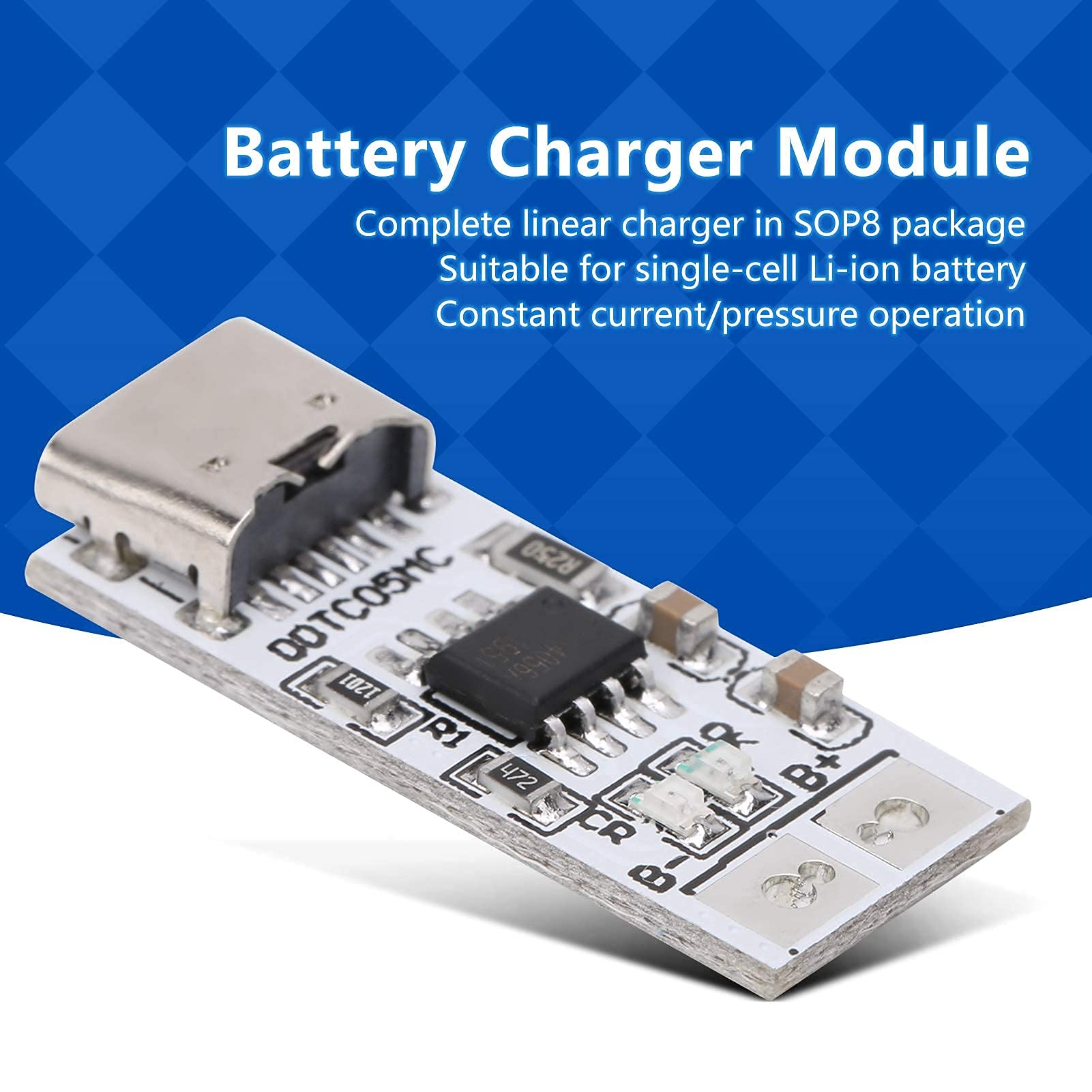 Module Chargeur Batterie Lithium Aideepen 10pcs TC4056 Type-C USB-C Input Interface USB 5V 1A 18650 LiIon Lithium Charging Board Charger Module With Dual Protection Functions (en Anglais Module Charge Batterie Lithium Tension de protection contre les décharges excessives : 2,4 V. ✔Protection de charge haute efficacité : La puce 4057 prend en charge la charge à courant/tension constants, un courant de charge maximal de 1 A et une protection contre la surchauffe pour une charge sûre et efficace. Éviter les connexions en série. Convient à tous les types de batteries lithium de 3,7 V pour une alimentation fiable de vos appareils. ✔Restriction de connexion en parallèle des batteries : Seule la connexion en parallèle est possible ; évitez la connexion en série. Les protections intégrées contre la décharge excessive (2,4 V) et la surcharge (4,2 V) assurent une protection complète de la batterie. ) avec une tension de coupure de charge de 4,2 V. Courant de charge : 1 A maximum (programmable). GUUZI 5pcs Micro Interface d'Entrée USB 5V 1A, Module de Chargeur de Batterie au Lithium 18650 5V Carte de Charge avec Double Fonction de Protection Type de batterie : Batterie au lithium 3,7 V (par exemple, 18650). Compatible with Various Lithium Batteries: Compatible with 3.7V single stage lithium batteries (for example, 18650, polymer batteries, etc.) with 4.2V charging cut-off voltage, suitable for all types of 3.7V lithium batteries for reliable power supply to your devices Précautions : Protection contre les inversions de polarité : Les batteries ne doivent pas être connectées en sens inverse. Tension de coupure de charge : 4,2 V. ✔Compatible avec diverses batteries au lithium : Compatible avec les batteries lithium monocellulaires de 3,7 V (par exemple, 18650, batteries polymères, etc. Limitation de connexion des batteries en parallèle : Seule la connexion en parallèle est possible. Protection contre les inversions de polarité : Oui. Limite de tension aux bornes de la batterie : La tension aux bornes de la batterie ne doit pas dépasser la tension nominale. Protection de charge très efficace : la puce 4057 prend en charge la charge à courant constant/à tension constante, un courant de charge maximal de 1 A et une protection contre la surchauffe pour une charge sûre et efficace Plage de température de fonctionnement : -40 °C à 80 °C. Mode de connexion des batteries : Seules les batteries en parallèle sont prises en charge.