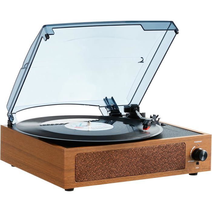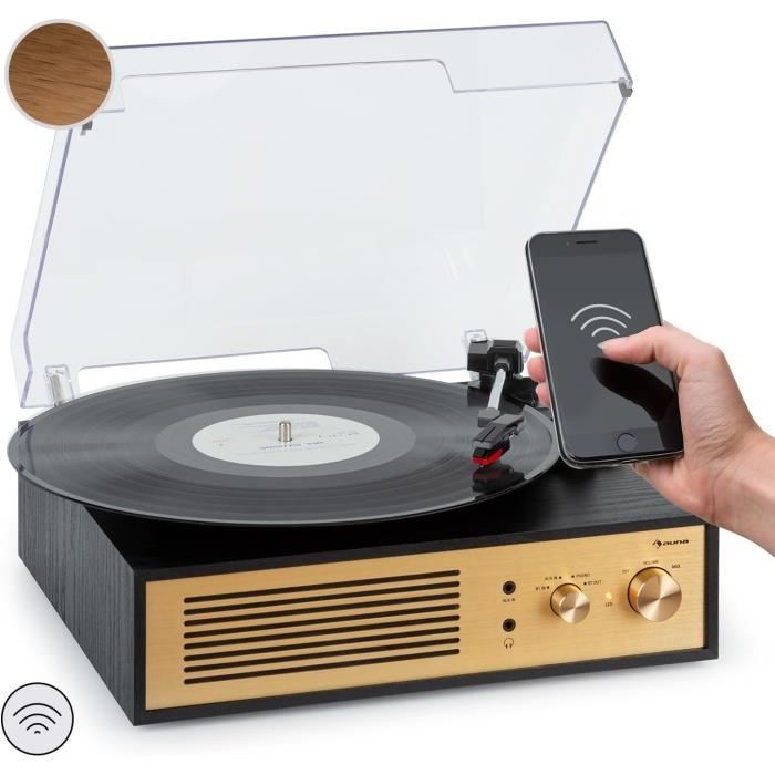 Auna Platine Vinyle, Tourne Disque Vinyle avec Entraînement par Courroie, Tourne-disques Audio Vinyle 33 tours en Verre Acrylique, Chaine Hifi, Platine Vinyle, Lecteur Vinyles, USB et Enregistrement PCÉcoutez, connectez, convertissez et faites l'expérience de l'ultime platine de conversion pour disques vinyles avec 2 vitesses de lecture (33 ⅓ et 45 RPM), une foule d'options de connectivité et une technologie d'entrée PC et USB. Ce meuble platine vinyle dispose de plusieurs fonctionnalités, lecteur CD, radio DAB/FM, pr USB, AUX et casque.LES VINYLES SE METTENT AU NUMÉRIQUE : Cette platine est doté d'une technologie de pointe avec un port USB qui vous permet d'enregistrer numériquement vos vinyles Une allure élégante avec les dernières technologies. FACILITÉ DE DÉPLACEMENT : Profitez de vos morceaux préférés partout et à tout moment grâce au design innovant de cette platine pour disques vinyles portable. LES VINYLES SE METTENT AU NUMÉRIQUE : Cette platine est doté d'une technologie de pointe avec un port USB qui vous permet d'enregistrer numériquement vos vinyles. Design Rétro Avec Fonction Arrêt Automatique Auna , Tourne Disque Vinyle, Lecteur CD Et Platine Vinyle Le tourne-disque Auna Pureness peut lire les disques vinyles anciens et nouveaux et impressionne par son design unique. FONCTION D'ARRÊT AUTOMATIQUE : Lisez vos disques vinyles préférés en toute sécurité grâce à la fonction d'arrêt automatique innovante. Le stylet s'arrête automatiquement lorsque le disque est terminé et protège votre platine vinyle de tout dommage. Caractéristiques du produit :Lecture à 2 vitesses de 33 ⅓ et 45 RPMFonction d'arrêt automatique avancée pour éviter de rayer les disques vinylesEntraînement par courroie intégré, entrée USB, système de lecture MC d'AudioTechnica et contrôle du sonConnectez et enregistrez facilement la musique des disques vinyles sur un PCPrend en charge les disques vinyles de 7, 10 et 12 poucesÉlégant design rétro vintage en verre acryliqueContenu de la livraison :1 x Platine vinyle1 x AdaptateurManuel d'utilisation multilingueDimensions :Dimensions de la platine : 42 x 35 x 9,5 cm (LxPxH)Longueur du cordon d'alimentation : 1,5 mPoids : 2,2 kg Auna platine tourne disque vinyle compacte avec couvercle (2 en ance REDÉCOUVREZ VOTRE COLLECTION DE DISQUES VINYLES : La platine vinyle Auna lis les disque vinyle 33 tours et est équipé des dernières technologies. Platine vinyle Platine vinyle Système stéréo Auna. Très bon état. Fonctionne parfaitement. Le couvercle peut être fermé tout en jouant et en LP ! Cool et rétro