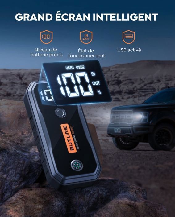 Avec un temps de veille d'environ 36 mois, ce chargeur batterie voitures est toujours prêt à aider. Booster Batterie Voiture 5000A, 26800mAh Démarreur Batterie Voiture (Jusqu'à 8.0L Essence & 8.0L Diesel), 12V Portable Jump Starter avec Pinces de Sûreté Intelligentes, Lampe à LED, Écran LCD Marque ➤ [26800MAH Banque d'Alimentation] Le booster batterie voiture puissant est également une banque d'énergie de voyage avec une capacité de 26800mAh, 2 ports USB (5V/3A)(5V/2., 1A) peuvent charger rapidement votre téléphone portable, tablette et autres appareils. ➤ [PORTABLE ET COMPACT] Dites adieu aux vieux démarreurs encombrants! ➤ [QUE RECEVRAI-JE?] Starter Batterie Voiture Tyonto 5000A, câbles jumper intelligents, câble de charge USB-C, boîte de rangement EVA, manuel utilisateur, support technique à vie et service clientèle 7j/7., Veuillez nous informer si vous avez des questions sur notre générateur de starter batterie voiturea. Booster Voiture VoltSurge Booster Batterie Voiture 5000A, Du00e9marreur De Batterie De Voiture Portable(Jusqu'u00e0 8.0L Diesel Ou Tout Gaz), 12V Jump Starter, Pinces Intelligentes Avec U00c9cran, Lumiu00e8re LED, Port De QC3.0 Batterie Voiture En cas d'urgence, ce booster de batterie générateur de saut est essentiel. Ce démarreur de batterie de voiture mesure 25,1 * 14,7 * 9,9 CM et ne pèse que 0,68 kg, le rendant plus compact et portable que d'autres kits de démarrage. Par rapport à d'autres boosters de saut similaires sur le marché, nous partons des besoins de l'acheteur et rendons tout plus simple. ➤ [SÉCURITÉ AVANT TOUT] Le paquet de batteries pour starter B03 est 100% sûr et à l'épreuve des étincelles. Démarreur de batterie de voiture 5000A Booster de batterie Les câbles de sécurité de la batterie peuvent atteindre tous les types de bornes de batterie de la voiture. Boostez votre véhicule instantanément avec le Buture Beta03 Jump Starter. Avec un courant de pointe 5000A, une capacité de 26800mAh, des ports de charge...