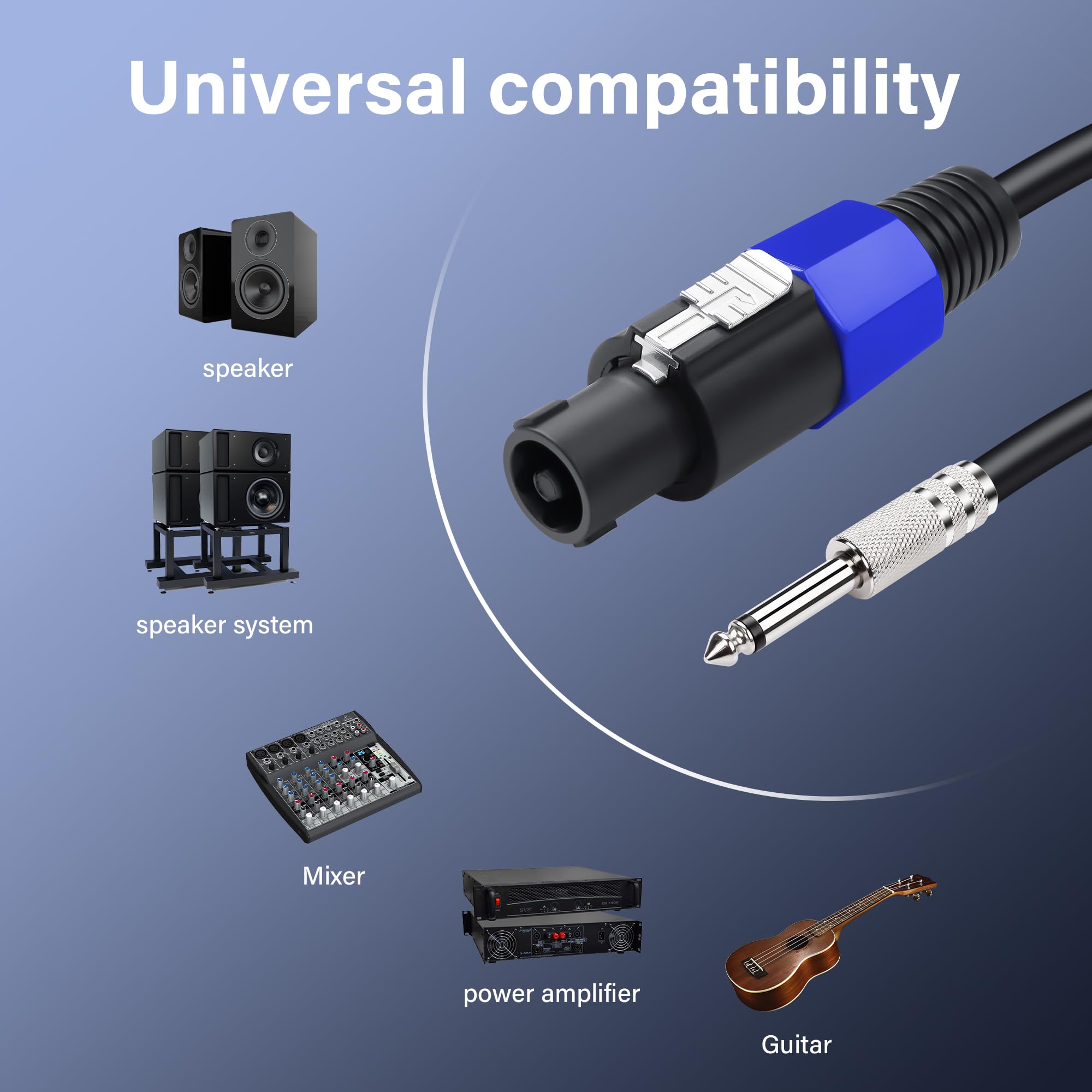Shop SinLoon Speakon to 1/4 po Câble Haut-Parleur 18AWG Speakon Mâle à 6,35 mm TS Cordon Audio Mâle 10 FT Serrure à Torsion Speakon à 1/4 po Câble Audio Mono pour Haut-Parleur Amplificateur Guitare (10 FT/3 M) online at a best price in Maroc. B0D9NLYF5G Courant jusqu'à 30 A. Cable Haut Parleur Câble De Haut-parleur Mono Speakon Vers 1/4 Pouces, Prise TS 6.35mm Vers Fil De Haut-parleur Mâle Speakon, Cordon De Connexion D'amplificateur Audio Pour Cordon DJ/PA Cable Jack 6.35 Description : 1., Connecteur 1 : Speakon mâle., 2., Connecteur 2 : 1/4 Mono Mâle., 3., Calibre du fil : 18AWG., 4., Avec un système de verrouillage à verrouillage par rotation « Quick Lock » précis et fiable., 5., Longueur du câble : 3 m/ 10 pieds/ 118 pouces. qualité sonore de niveau hifi, délicate et lisse, qualité sonore épaisse et pleine. Un câble Speakon vers TS 6,35 mm idéal aide le son de votre instrument. Connecteur mono 1/4 : prise nickelée de 6,35 mm, résistante à la corrosion et au signal fort, pour microphones, mixeurs, guitares et autres équipements audio 100ft 12awg Jaqueta De PVC Cabo Jack Speakon Conector Cabo De Áudio 1.5m 10m 20m 【18AWG】 Câble d'extension audio de 3 m vers 1/4 utilisant un fil de cuivre sans oxygène de 18 AWG, câble en PVC de haute qualité, diamètre extérieur du câble : 8,0 mm. Le corps du câble est solide et doux, transmission haute fidélité sans perte. Le forfait comprend : 1 * câble haut-parleur Speakon vers 1/4