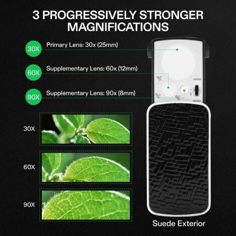 Fonctionne avec 3 piles AAA (non incluses dans le colis). 2 LED pour la grande lentille et 1 LED pour la petite, assurent un meilleur effet d'éclairage. Les ampoules LED blanches à faible consommation d'énergie nécessitent 3 piles AAA qui durent longtemps (piles non fournies). Également livré avec 1 lumière noire UV pour la détection de faux devises. Loupe à bijoux : Modèle de pile : LR44 (incluse). Nombreuses utilisations : idéal pour les bijoux, pièces de monnaie, timbres, antiquités, etc. Excellent pour lire les petits détails sur les pièces d'ordinateur et l'électronique Lntyq 30 Fois Trois Sources De Lumière USB Chargeant La Loupe Portative Uv Lumiere Violette Detecteur De Billets De Banque Loupe Avec Echelle De Lumiere Led Loupe De Bijoux Grossissante 86210550 Précautions d'emploi : 1., Ne pas exposer la loupe directement au soleil, les yeux ne visent pas la mise au point pour éviter de se brûler., 2., Lorsque le soleil est direct, ne placez pas de matériaux inflammables sous la mise au point 3 grossissements : 30x (25 mm), 60x (12 mm), 90x (8 mm). Loupe 3x (grand objectif) et 45x (petite lentille), design d'éclairage indépendant, 2 LED pour la grande lentille et 1 LED pour la petite, pour un meilleur effet d'éclairage. Loupe de poche multi-puissance Trois verres optiques transparents progressivement plus puissants conçus pour les personnes âgées, les amateurs, les bijoutiers professionnels, les horlogers et les collectionneurs de pièces et de timbres. Loupe Diamants Lumière Uv Mini Loupe 60X Avec Lumière UV LED Loupe De Poche Loupe De Loupe Lumière UV LED 30x 60x 90x Loupe à Bijoux avec lumière UV LED et loupe portative, 2 pièces AFUNTA 30x, 60x, 90x, loupe de Poche coulissante pour Bijoux/Diamants, loupe de Poche pour Personnes âgées Dimensions du produit : environ 8,5 x 4,6 cm., Tension : 1,5 V. Détails de la main Notre produit dispose de 3 lumières LED qui vous donnent une meilleure situation de lecture. Diamètre de l'objectif : 30 x 25 mm, 60 x 12 mm, 90 x 8 mm. Diamètre de la petite lentille : 2 cm., Longueur totale : 19 cm. Le bouton sur la poignée est pratique pour les personnes âgées pour allumer ou éteindre facilement. Excellent pour la lecture, les circuits, l'évaluation de bijoux, etc.