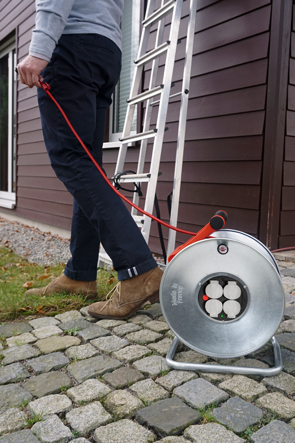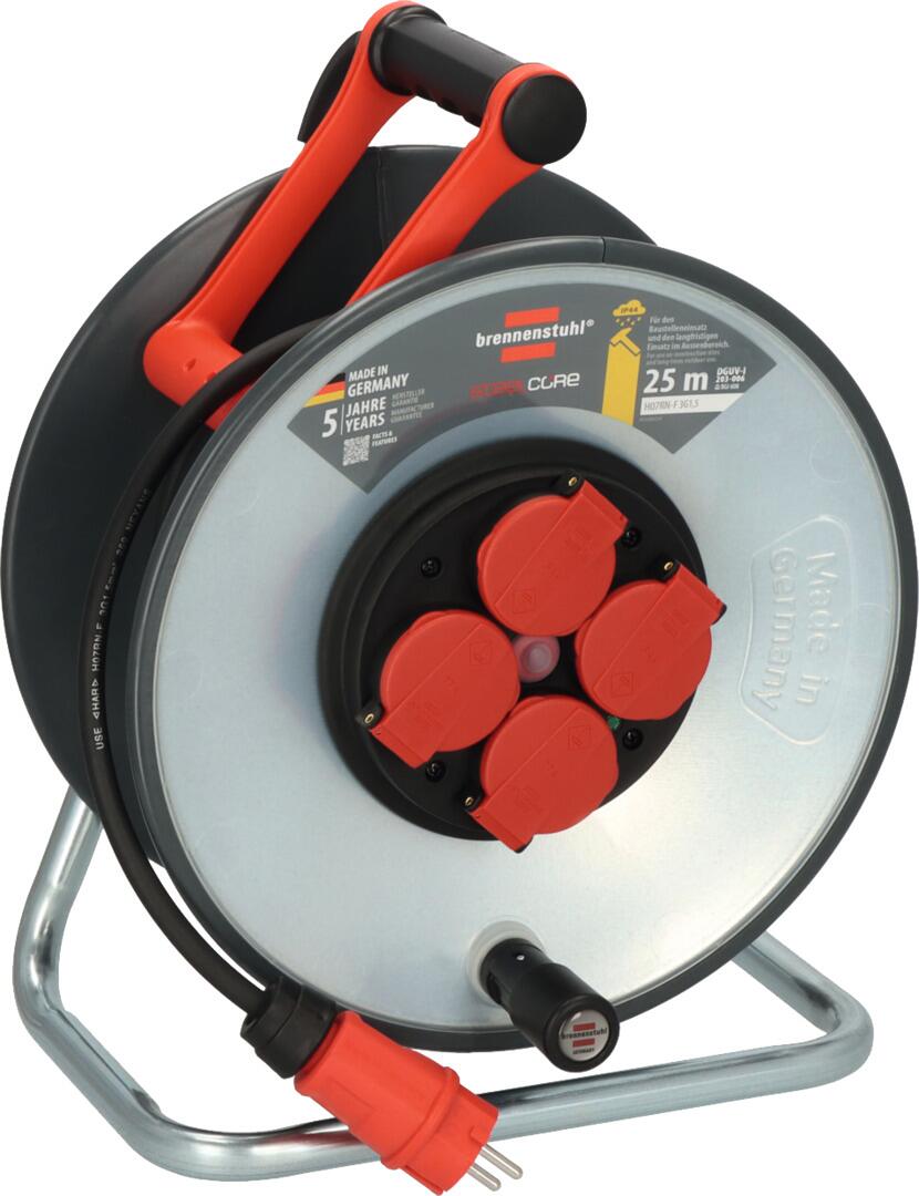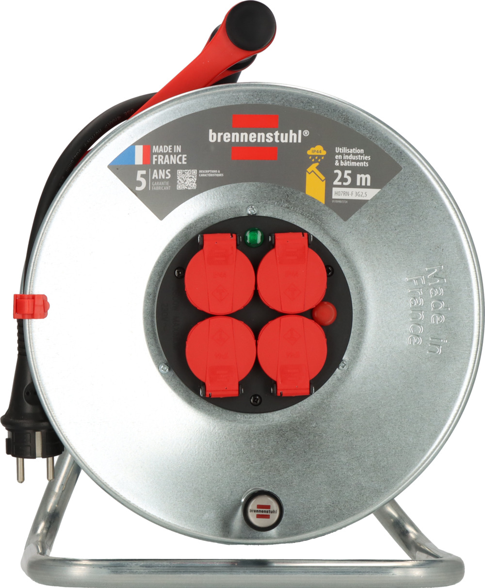 Brennenstuhl Enrouleur de câble professionnel Cube KA 3210 5 33 m Kabeltrommel 50m Outdoor Brennenstuhl Professional SteelCore Enrouleur De Câble SC 3210 IP44, 33 M H07BQ-F 3G2,5, Corps De Bobine En Tôle D'acier, Utilisation Sur Les Chantiers De Construction Et Utilisation Extérieure Rallonge Enrouleur de câble SteelCore avec poignée rotative pliable robuste pour l'enroulement et le déroulement sans effort du câble et protection contre la surchauffe avec témoin lumineux en cas de surchauffe et de surcharge Grâce au câble BREMAXX PUR (câble BQ) et au degré de protection IP44, l'enrouleur de câble SteelCore SC 3210 de Brennenstuhl est parfait pour une utilisation permanente en extérieur, par exemple sur les chantiers de construction. L'enrouleur de câble avec 4 prises de sécurité (protection contre les éclaboussures, avec couvercles à fermeture automatique) et fiche de contact de sécurité extra robuste convainc également par les caractéristiques suivantes : Corps de moulinet en tôle d'acier, isolé à l'avant et à l'arrière pour un fonctionnement robuste Poignée de transport innovante « cablepilot » pour un guidage parfait des câbles Grande poignée pivotante robuste pour enrouler et dérouler le câble sans effort Boîtier de moulinet résistant à l'impact froid jusqu'à -25 °C Insensible à l'essence et aux huiles Câble BREMAXX-PUR (câble BQ) : résistant aux acides et à l'huile, résistant aux intempéries et aux microbiens, résistant au froid jusqu'à -40 °C Protection contre la surchauffe avec témoin lumineux en cas de surchauffe et de surcharge Avec indicateur visuel de préparation dans le bloc de contact Indice de protection : IP44., Longueur du câble : 33 m. Enrouleur de câble 33 m (H07BQ-F 3G2,5) avec un corps en tôle d'acier, isolé à l'avant et à l'arrière - pour une utilisation sur chantier selon la norme DGUV 203-006 (anciennement BGI 608) et une utilisation permanente en extérieur La poignée de transport innovante « cablepilot » assure un guidage optimal des câbles - Pivote des deux côtés pour un transport et une suspension faciles La grande manivelle pliable, stable et robuste facilite l'enroulement et le déroulement du câble. Les 4 prises de courant étanches avec couvercles à fermeture... Enrouleur de câble avec 4 prises de protection (protection contre les éclaboussures, avec couvercles à fermeture automatique) et fiche de contact de protection robuste Elle est également résistante aux acides et à l'huile, aux intempéries et aux microbes et au froid jusqu'à -40 °C.