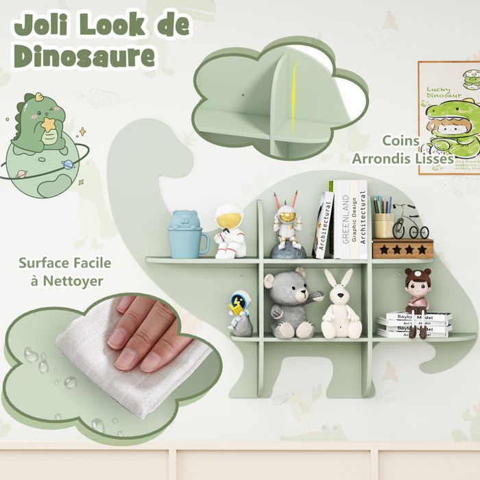 Cette étagère murale en forme de dinosaure verte, toute en douceur et en fantaisie, transforme le rangement en aventure ludique. Les + produit : Couleur douce et intemporelle Idéale pour la chambre de votre enfant Pratique 5 espaces de rangement Dans la chambre de votre enfant, Brachi ne fait pas que veiller : il garde précieusement ses livres préférés, ses petits trésors et ses dinos en plastique comme un vrai compagnon de jeu. Dimensions et caractéristiques : Dimensions: L 108 x P 16,5 x H 78,5 cm Couleur: Vert Matière: MDF Poids max supporté: 5 kg Poids net: 6,7 kg Dimensions entre les étagères: Côté gauche du haut vers le bas: 15,5 / 20 / 15 cm Au milieu: 21 / 27,8 / 27,8 cm A droite: 18,5 / 31 cm Étagère murale 65 cm Kiddy - Vert Menthe Idéale pour la chambre de votre enfant , Pratique , 5 espaces de rangement Meuble Etagère de rangement Dinosaure en Bois Vert étagère Murale Brachi 108cm Etagère Murale Dinosaure 5 Espaces De Rangement Vert étagère Enfant Dinosaure Brachi 25 grand dnosaure étagère étagère pour chambre | Etsy | Dnosaur room decor, Dnosaur nursery...