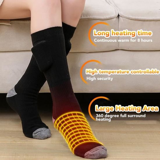 Chaussettes Pour Sport Hiver Chaussettes Chauffantes Chaussettes De Sport Réglages De Chauffage Chaussette Ski Chauffante Chaussette chauffante sont également l'un des meilleurs cadeaux pour la famille et les amis pendant la période des vacances, un cadeau chaud pour vous garder, vous et vos proches, plus au chaud en cet hiver froid. Avec 3 niveaux de chaleur réglables (jusqu'à 60°C), elles chauffent en 30 secondes chrono. Taille unique qui s'adapte du 37 au 48, donc pas de prise de tête Les chaussettes chauffantes offrent toujours des pieds chauds grâce à l'élément chauffant cousu.La chaleur peut être facilement contrôlée à l'aide de l'application sur votre téléphone mobile.Les chaussettes sont alimentées par des piles compactes pouvant durer de 4 à 13 heures Prise En Charge Du Lavage à La Main Et En Machine: Chaussettes chauffantes vélo lavables sont livrées avec un sac à linge. S'il y a des problèmes avec l'utilisation, n'hésitez pas à nous le faire savoir. Chaussettes chauffantes, 3 réglages de température, contrôle Haute Capacité De La Batterie & Indicateur LED: Chaussettes chauffantes sont alimentées par 2 batteries de 5000mAh qui durent jusqu'à 4 heures au niveau de chauffage le plus élevé et 8 heures au niveau de chauffage le plus bas, vous n'avez donc pas à vous soucier de manquer rapidement d'énergie et pouvez savoir combien reste grâce à l'indicateur lumineux LED vert sur les batteries. 1 Température Réglable 2 Recharge 2 en 1 3 Mode d'emploi 4 Méthode de Lavage Chauffage Instantané & 3 Modes De Température: 2024 Chaussettes chauffantes Newly Upgraded ont un temps de chauffe rapide pour s'assurer que vous vous sentez au chaud dans les 30s après les avoir mises. Notre conception nouvellement améliorée de cinq couches de tissu chaussettes chauffantes sont plus épais par rapport aux chaussettes chauffantes ordinaires sur le marché, ce qui en fait un bon choix pour ceux qui ont besoin de chaussettes chaudes plus épaisses. Vous pouvez régler votre température préférée afin de faire l'expérience de la chaleur de manière individuelle. Vous n'avez pas à vous soucier de laver les chaussettes chauffantes homme femme à la main dans le froid de l'hiver, ce qui pourrait endommager vos mains. Après avoir retiré les piles, vous pouvez placer les chaussettes chauffantes dans le sac à linge et les laver en toute sécurité dans la machine à laver. Pas Besoin De Choisir La Taille: Une taille universelle de chaussettes chauffantes pour hommes et femmes (pour EU 37-48), super élastique, extensible, pas difficile sur la forme du pied, différentes tailles de pieds peuvent être facilement portées.