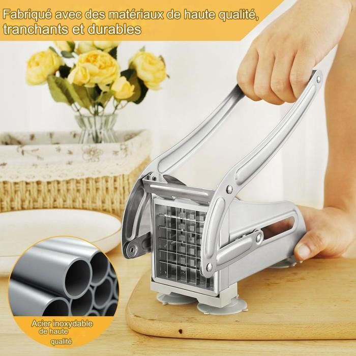 Équipé de deux grilles de découpe interchangeables (6 mm et 10 mm d'épaisseur), cet ustensile permet de réaliser des frites maison parfaites et des bâtonnets de légumes uniformes en un seul geste. Coupe Frites ménager Inox avec 2 grilles Sa construction robuste en plastique résistant et lames en acier inoxydable assure une coupe précise et durable. Le démontage facile et le nettoyeur de grille inclus simplifient l'entretien. ENTRETIEN FACILE: Démontable pour un nettoyage complet, fourni avec un nettoyeur de grille spécial Sans BPA Acier Inoxydable Coupe-frites Manuel CF4 11 Mm - Coupe Légumes Professionnel - Dito Sama | Brigade Hocaré Lames Acier Inox Sans BPA Le design compact de 12 x 9,5 x 15 cm s'intègre facilement dans votre cuisine. Ce coupe-légumes allie qualité professionnelle et facilité d'utilisation pour des préparations culinaires rapides et précises. DESIGN PRATIQUE: Base antidérapante pour une stabilité optimale pendant l'utilisation, compact et ergonomique La base antidérapante garantit une stabilité optimale pendant l'utilisation. Coupe-Frites, Coupe Frites Manuel, Coupe Frite Professionnel avec 2 Lames de Rechange en Acier Inoxydable et Base D'aspiration Sécurisée pour Pommes de Terre Carottes Concombres Ananas (Argent A Pratique et polyvalent, il convient parfaitement pour couper carottes, concombres, oignons et autres légumes. Tophie Coupe-ites avec 2 lames de rechange tranchantes en acier inoxydable de haute qualité et pieds antidérapants - 2 lames de tailles différentes - Coupe-légumes - Idéal pour les pommes de terre