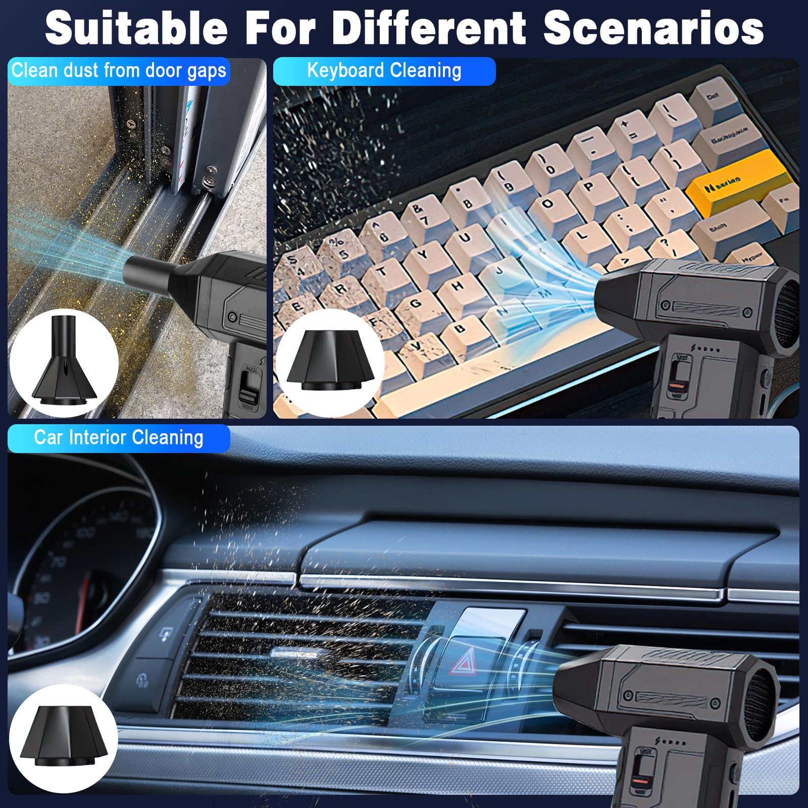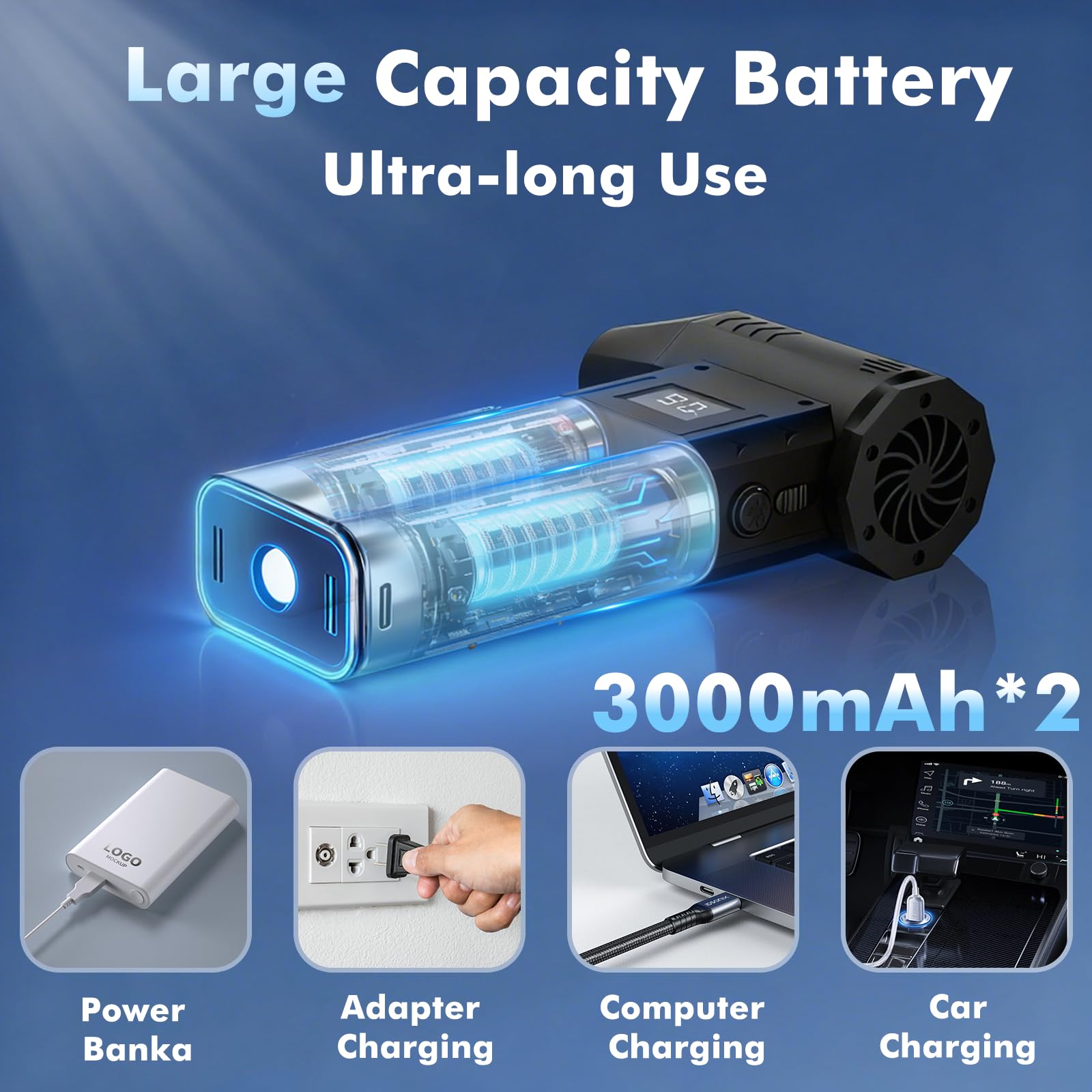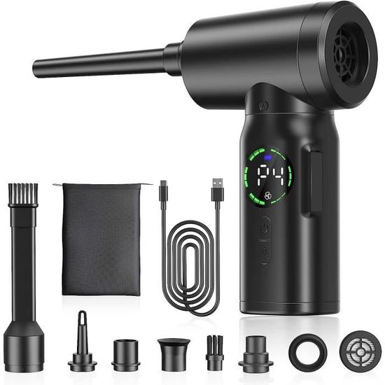 Il offre quatre modes de ventilation : vent doux, fort, très fort et violent, pour une utilisation plus facile. Jardin - Découvrez notre offre Souffleur Air Comprimé avec Écran, Dépoussiéreur Electrique avec Éclairage Auxiliaire LED,4 Vitesses pour Voiture,Clavier,Barbecue [Super Puissance] Ce souffleur air comprimé atteint une vitesse de rotation de 130 000 tr/min, ce qui lui permet d'éliminer efficacement la poussière et les débris. Attention : ne pas utiliser l'appareil pendant la charge ! Le puissants souffleur pc à l'élimination des domestiques, équipements électroniques, sièges de voiture, canapés,des climatiseurs, neige dans la cour et aux activités de plein air telles que le camping et le barbecue. Vous pouvez facilement régler la vitesse de ventilation sans réglages complexes. [Lumière Auxiliaire & Lampe de Poche 3 Modes] Ce dépoussiéreur electrique est équipé d'un éclairage auxiliaire LED. Souffleur d'air comprimé, mini dépoussiéreur électrique 130 Idéal pour le bureau, la maison, le nettoyage de voiture et le camping en plein air. Son souffleur electrique avec écran, équipé d'une batterie rechargeable grande capacité de 3 000 x 2 mAh, offre une longue autonomie et constitue une alternative économique et écologique à l'aérosol, pour un nettoyage plus efficace. Trois modes de lampe de poche sont disponibles en bas, et des appuis courts permettent de changer de mode : lumière constante, SOS et stroboscopique. Nettoyeur de dépoussiéreur à air comprimé avec moteur de brosse à écran... Dépoussiéreur 130 000 Tr/min Portable Souffleur Air Comprimé Avec Écran,Dépoussiéreur Electrique Dépoussiéreur PC Et Clavier Appuyez longuement pendant environ 5 s pour l'allumer, puis de nouveau pendant environ 5 s pour l'éteindre, ce qui facilite le nettoyage.