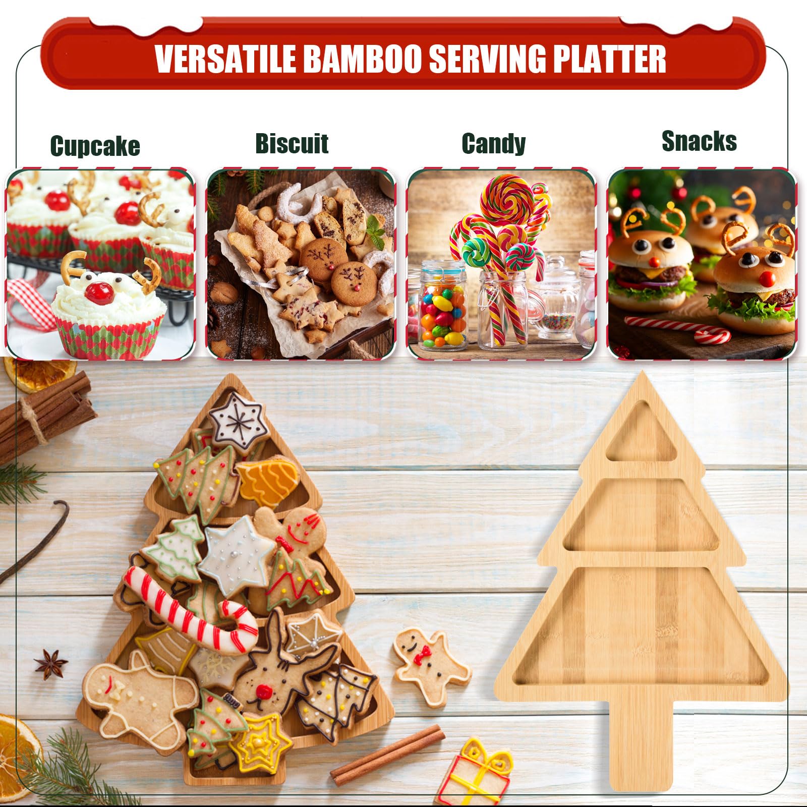 Surface antiadhésive et facile à nettoyer Laver à la main avec du savon doux, essuyer immédiatement, éviter le lave-vaisselle, le micro-ondes et une exposition prolongée au soleil ou à l’eau. Illuminez les moments magiques de Noël avec nos plateaux en bambou naturel, apportant chaleur à chaque gourmandise ! 100 % Bambou Naturel Fabriqués à partir de bambou naturel issu de sources durables, durables, écoresponsables, réutilisables et parfaits pour la saison de Noël ! Présente les friandises saisonnières avec style et ajoute charme et caractère aux célébrations de Noël. 🎄【Surface facile à nettoyer】 Chaque plateau est poli avec des bords arrondis et une surface lisse, ce qui facilite son essuyage après utilisation. Plateau en bois de noël, chapeau de père noël en forme d'élan, rustique multifonctionnel, bijoux, assiette de service de fruits, support de rangement, fournitures de fête acheter à prix bas - livraison Chaque plateau met en valeur le grain du bambou, combinant fonctionnalité et décoratif. 🎄【Décoratif et fonctionnel】 Sert à la fois de plateau pratique et de centre de table festif. Snacks et desserts bien présentés Idéal pour présenter biscuits, gâteaux, fromages, pains, fruits, bonbons, noix, etc. Convient pour les repas en famille et les fêtes de Noël, peut également être utilisé comme élément décoratif dans la maison. Plateau de service en bambou en forme d'arbre Comprend 3 plats de service amovibles en céramique Parfait pour servir des collations, des fromages, des trempettes ou des friandises Utilisez le plateau et les bols ensemble ou séparément pour plus de flexibilité Fabriqué à partir de bambou naturel – chaque article peut varier légèrement en couleur et en taille Un ajout élégant et... Description du produit Créez des souvenirs avec les plateaux de service en bambou de Noël TJ POP sur votre table ! Utilisez-le comme pièce maîtresse de votre table de Noël ! 🎄【Utilisation polyvalente】 Idéal pour servir des en-cas, fruits, noix, biscuits ou petits amuse-bouches. Finition polie et lisse Coins arrondis, sans éclats ni arêtes vives, assiettes non peintes et sûres pour les aliments. Plateau de service festif : installez une table de Noël avec cet élégant plateau en bambou, parfait pour les collations, les cookies et les apéritifs Plateau de service en bambou vintage 🎄【Designs festifs】 Disponible en formes classiques de Noël : sapin, sapin à 3 compartiments, Père Noël, bonnet de Noël, renne, cloche et flocon de neige.