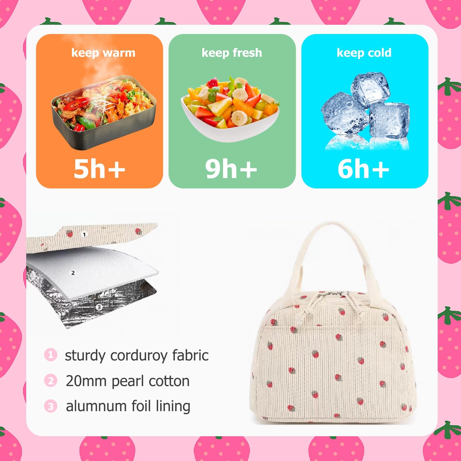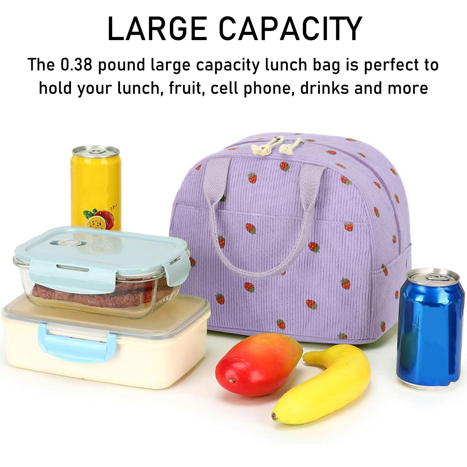 【Spacieux & Organisé】Sac à lunch isolé en étanche multi-compartiments : poche principale zippée pour les repas et fruits, poche avant pour couverts, mouchoirs ou accessoires. Que vous souhaitiez vous procurer un lunch bag pour femme, homme, enfant ou bébé, vous trouverez forcément votre bonheur. De plus, la majorité de nos produits sont des lunch bag isothermes afin de vous permettre de garder la température de vos repas chauds ou froids Caractéristiques Ce sac repas isotherme maintient la température idéale pendant 8 heures – doublure PEVA et extérieur en velours côtelé préservent fraîcheur et fraîcheur des boissons. Cadeau idéal pour la Fête des Mères ou un anniversaire. Se plie compactement après utilisation. 【Étanche & Facile à Nettoyer】Sac à déjeuner pliable léger revêtement intérieur imperméable et anti-graisse – nettoyage rapide avec un papier absorbant. 【Transport Facile】Sac isotherme repas poignée légère mais résistante, idéale pour le bureau, l'école ou les voyages. Il peut être utilisé comme sac à lunch, sac de pique-nique et sac d'articles divers, adapté aux femmes et aux étudiants. Matériaux de haute qualité: coton... Multi-compartiments pour organiser repas, encas et accessoires. Marguerite Sac Isotherme Repas Femme Homme Glaciere Souple Lunch Bag Lunch Box avec Bandoulière Sac à Lunch Isolé étanche Motif Fraise Sac Isotherme Repas Bureau Lunch Bag Sac à Déjeuner Fraîcheur Repas Sac Isotherme Réutilisable Bureau école Pique-nique Une organisation parfaite à portée de main. Fond imperméable et intérieur lavable facilitent le nettoyage en cas de fuites. Éviter le lavage en machine pour préserver l'isolation et la qualité du tissu. 【Sac Repas Isotherme & Étanche】Triple isolation : doublure intérieure PEVA alimentaire, noyau en ouate perlé et extérieur en velours côtelé. Conserve les plats chauds 8 heures et les boissons fraîches – comme à la sortie du frigo.