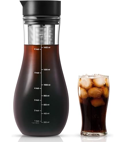 Nettoyage facile : la cafetière passe au lave-vaisselle, ce qui facilite le nettoyage. Avec son design bien pensé, cette cafetière fera passer votre plaisir de café à un nouveau niveau. Les joints sont fabriqués en silicone de qualité alimentaire et garantissent une étanchéité sûre sans affecter le goût de votre café. Matériau sûr et sain : la cafetière est sans BPA et utilise du silicone de qualité alimentaire pour une préparation du café sans danger. Le couvercle de fermeture et l'insert de filtre sont fabriqués en acier inoxydable 18/10 chrome-nickel de haute qualité, ce qui les rend durables et antirouille. Gräwe Cold Brew Kaffeebereiter 1l ab 17,90 € | Preisvergleich bei La capacité de 1,5 litre est suffisante pour vous et vos invités. Nettoyage facile : le nettoyage est facile grâce au lave-vaisselle adapté. CARAFE FILTRANTE EN VERRE WESSPER D2 BOROSILICATE FUTUREFLOW 3,3 L MENTHE 5x FILTRE À EAU... Préparation Café Glacé GRÄWE Cold Brew Coffee Maker 1,5 L – Cafetière Avec Carafe En Carafe The Glacé L'échelle avec indication en millilitres vous permet de mesurer avec précision la quantité désirée pour obtenir le froid parfait à chaque fois. La cafetière GRÄWE Cold Brew séduit non seulement par sa fonction, mais aussi par son aspect esthétique. Commandez GRÄWE Cold Brew Coffee Maker 1,5 l - Cafetière avec carafe en verre borosilicate et filtre en acier inoxydable - Verseuse à froid pour café, café glacé - Machine à thé froide 6 tasses La verseuse en verre de la cafetière est fabriquée en verre trempé borosilicate, qui est non seulement robuste, mais aussi résistant à la chaleur. Qualité supérieure : la cafetière GRÄWE Cold Brew est fabriquée en verre trempé borosilicate de haute qualité et en acier inoxydable 18/10 au chrome-nickel. Vous cherchez un moyen de déguster un café dans sa forme la plus délicieuse et la plus rafraîchissante ? Alors la cafetière GRÄWE Cold Brew est la réponse à vos souhaits. Offrez-vous un plaisir de café incomparable avec GRÄWE!