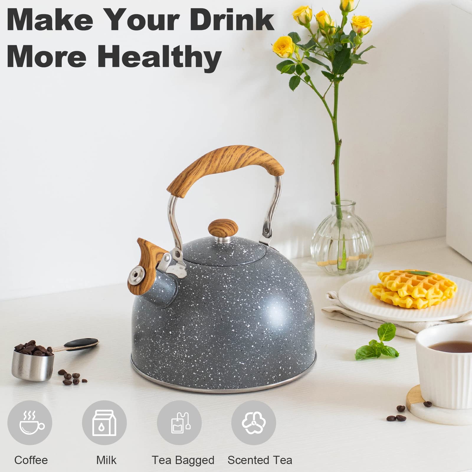 Conduction thermique efficace: Cette bouilloire de thé sifflante a une excellente conduction thermique, ce qui raccourcit le temps d'ébullition., ., Il peut être utilisé sur divers stovetops, y compris les cuisinières électriques et à induction, ce qui le rend très pratique. Description: Cette bouilloire de thé sifflante est non seulement pratique mais aussi élégante, ce qui en fait un excellent ajout à n'importe quelle cuisine., ., Fabriqué en acier inoxydable de qualité, il garantit que l'eau que vous faites bouillir est sûre et saine à boire., ., Avec une capacité de 2,5 L, il peut fournir suffisamment d'eau pour toute la famille ou les rassemblements., ., Le sifflet automatique et la conception anti-poussière le rendent facile à utiliser et à maintenir., ., Sa conduction thermique efficace raccourcit le temps d'ébullition, et il peut être utilisé sur diverses cuisinières., ., La poignée en bois isolée est résistante à la chaleur et pratique et versée., ., Cette bouilloire sifflante est non seulement fonctionnelle mais aussi élégante, ce qui en fait un excellent pour les amis et la famille., ., Fonctionnalités:., ., Tire de sifflet Kettle., ., -Color: ., ., -Material: acier inoxydable., ., -Size: environ 21,5x19x19 cm / 8., 46x7., 48x7., 48 pouce., ., Remarque: Mesure manuelle, veuillez laisser de légères erreurs sur la taille., ., Les couleurs peuvent exister une légère différence en raison de différents écrans., ., Package comprenant 1 * Whistling Tea Kettle. Poignée en bois pliable: La poignée en bois isolée est conçue pour être résistante à la chaleur, ce qui le rend facile à verser., ., Il est également confortable à tenir et facile à saisir. Bouilloire à thé sifflante verte de 2,8 L avec théière à poignée en grain de bois CUTICATE Désirtaux et conception anti-poussière: le coup de sifflet automatique est clair et non sévère, vous alertant lorsque l'eau bouillonne., ., Le bec a également une couverture anti-poussière pour garder l'eau au chaud et empêcher la poussière d'entrer. Commandez Thé sifflement bouilloire avec poignée en bois 2, 5 L texture martelée en acier inoxydable théor à thé sans odeur pour la cuisinière à induction Stovetop Bouilloire Sifflet Acier Inoxydable Eosnow Bouilloire à Sifflement 2,5 L En Acier Inoxydable, Cuisinière à Bouilloire Pour Cuisinière Induction Et Tous Feux Cette petite bouilloire à thé convient à la famille ou à une fête de 4 à 5 personnes. La capacité de 2,5 litres vous permet d'attendre environ 10 tasses d'eau après une seule ébullition, ce qui vous fait gagner du temps en éliminant le besoin de faire bouillir l'eau encore et encore froid