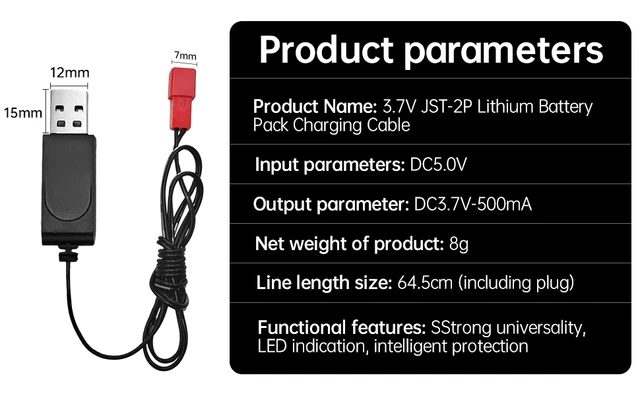 Compatibilité Étendue : Ce chargeur USB RC universel est conçu pour les batteries LiPo 7., 4V 2S, idéal pour une variété de jouets télécommandés tels que les voitures RC, drones, bateaux, avions et hélicoptères. Chargeur Batterie RC 2S 7.4V Aliwisdom USB Chargeur Câble RC Universel Avec Connecteur SM-2P Plug Pour NIMH/NICD Batterie (4-8S) 4.8V 6V 7.2V 8.4V 9.6V, Compatible Voiture RC Bateau Drone Avions RC (6V Chargeur Compact Connecteur Sm-3p Le chargeur USB LiPo 7., 4V avec connecteur SM-3P est l’accessoire idéal pour recharger vos batteries LiPo utilisées dans des voitures RC, des drones, des avions RC et d'autres équipements télécommandés. Sécurité Maximale : Le câble chargeur USB LiPo est équipé de protections contre la surtension, la surcharge et les courts-circuits, garantissant une charge en toute sécurité pour vos batteries LiPo. Spécifications Techniques : Entrée : 5V DC, Sortie : 7., 4V 1000mAh. Une fois la batterie chargée, le voyant vert reste allumé, et le rouge s’éteint pour indiquer que la charge est terminée. Grâce à son indicateur LED, vous pouvez facilement suivre l’état de la charge. Ce chargeur batterie RC USB est spécialement conçu pour batteries LiPo et ne doit pas être utilisé avec d'autres types de batteries. Le paquet comprend: 1 * Chargeur USB RC Universel Ce chargeur compact et pratique vous permet de recharger vos batteries rapidement et en toute sécurité. Il est compatible avec une large gamme de batteries LiPo 7., 4V 2S et est idéal pour les utilisateurs souhaitant maintenir leurs jouets télécommandés toujours prêts à l’emploi. Chargeur Voiture Exost 2 Chargeurs USB RC Universels - Pour Chargeur hélicoptère : le top 30 des eilleurs de 2025 | Achat Gagnant Ce chargeur utilise une entrée USB 5V DC, ce qui le rend compatible avec de nombreux adaptateurs secteur USB, ordinateurs portables ou banques d’alimentation, facilitant ainsi l’utilisation dans diverses situations, que ce soit à la maison, en atelier ou en déplacement.