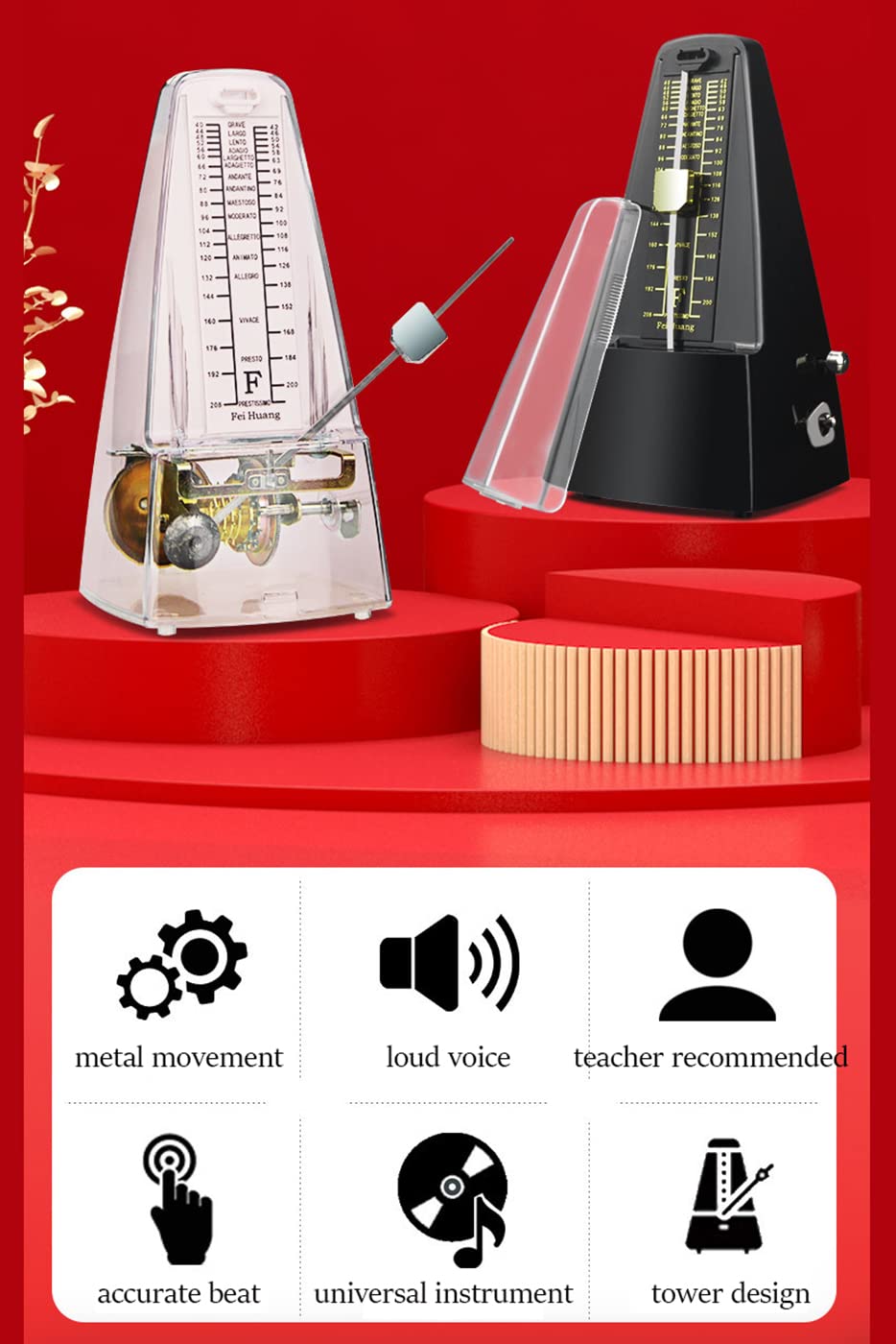 Grâce à sa facilité d'utilisation, le métronome convient à tous les âges. Notre métronome mécanique offre des rythmes précis et une utilisation facile qui vous permet de vous concentrer pleinement sur votre musique. Sa compatibilité avec une variété d'instruments en fait le compagnon idéal pour les pianistes, guitaristes, violonistes et beaucoup d'autres musiciens. Le design élégant dans un style classique fait de ce métronome un accessoire élégant dans n'importe quelle salle de musique. Idéal pour les exercices en solo ou les répétitions de groupe, il assure une synchronisation fiable. Outil Apprentissage Musique Métronome Mécanique, Métronome Classique Antique Transparent, Haute Précision, Métronome Universel For Violon Et Guitare, For Instruments De Musique For Les Amateurs De Musique Plasticmovement(White,P Métronome Transparent Tempo 40-208 BPM Pas besoin de piles ou d'électricité. C'est un outil indispensable pour les musiciens de tous les styles qui apprécient la précision. Investissez dans ce métronome fiable et découvrez les avantages d'un métronome mécanique qui allie parfaitement tradition et technologie. Des rythmes très lents aux battements rapides, il est adapté à tous les défis musicaux. Métronome mécanique transparent avec clochette - Métronome universel à remonter avec son fort - Contrôle de vitesse - Pour guitare, piano, violon, tambour : : Instruments de musique, scène et studioDescription du produit Le métronome mécanique dispose d'un design à remonter, d'une sélection de type de battement et d'un contrôle de la vitesse de battement. C'est un... Ce métronome est un outil indispensable pour tous ceux qui veulent améliorer leur expression musicale. Que vous soyez débutant ou professionnel, ce métronome soutient chaque musicien avec une répartition exacte du temps et améliore le timing. La large plage de tempo du métronome permet une flexibilité pour différents styles de musique. Ce métronome au design classique est non seulement fonctionnel, mais aussi un accessoire élégant pour votre salle de musique. Achetez QUARKZMAN Metronome Mecanique, Chronometre Musical De Haute Precision Metronome Universel Pour Piano Guitare Violon Ukulele, Transparent Métronome mécanique de type tour, pendule rythmique en anneau sonnerie parfaitement saisir le rythme, pour guitare basse piano batterie violon accessoires Réglez facilement le rythme souhaité et commencez à pratiquer immédiatement.