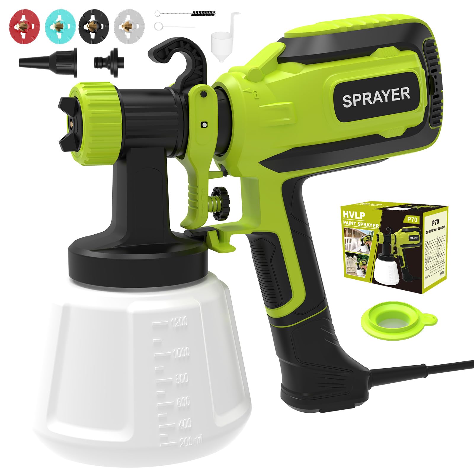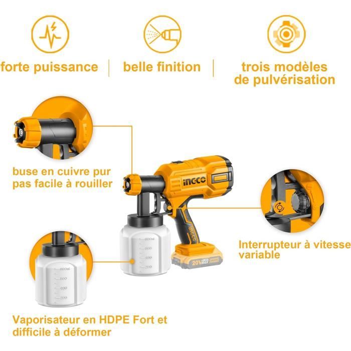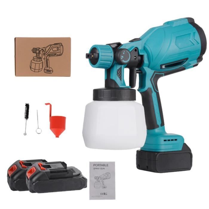 Selon les différentes exigences en matière d'effet de pulvérisation, un contrôle raisonnable du débit de peinture peut obtenir de meilleurs résultats et éviter le gaspillage de peinture. Pistolet à Peinture Sans Fil 800ml, 650ml/min, 42000rpm, 3 jets réglables, Buse 2.5mm, Refroidissement Rapide - Bricolage TACKLIFE Pistolet à Peinture, Pulvérisateur électrique 500W HVLP, Débit Réglable à 800ml/min, 3 Modes De Pulvérisation Et 4 Buses, Bouton De Soupape Réglable, Récipient De Peinture 900ml SGP15AC Grâce à son crochet et à ses outils de nettoyage, il est facile à ranger et à nettoyer. La conception anti-poussière empêche les particules nocives de pénétrer dans le moteur, garantissant ainsi la longévité du pistolet à peinture. Conçu pour le confort, ce pulvérisateur offre une prise en main ergonomique, pour une expérience de travail agréable et efficace. Le débit réglable assure un contrôle précis pour de meilleurs résultats. 【Large application】 Le pistolet a peinture electrique convient à la plupart des projets de peinture, tels que les murs, les meubles, les clôtures, les décorations, les armoires, l'artisanat, les plafonds, les portes, les tables et chaises de jardin, etc. Description : Pulvérisateur de peinture multifonction, moteur de 500 W (32 000 tr/min), 4 buses en cuivre et 3 modes de pulvérisation, réservoir de 800 ml, débit réglable, idéal pour une utilisation en intérieur et en extérieur. Pulverisateur Peinture Sans Fil Pistolet Peinture Electrique, Pistolet à Peinture 500W, Pulvérisateurs De Peinture Avec 4 Buses Et 3 Modes De Pulvérisation, 800ML Pour Clôtures, Armoires, Murs, Plafonds (avec Câble Peinture Murale Interieur C'est un outil précieux pour peindre votre maison ou votre jardin. Présentation du Pistolet à PeintureLe pistolet à peinture électrique de la marque VIDAXL, référence 145287, est un outil idéal pour les travaux de peinture en intérieur et en extérieur. Doté d'une puissance de 500 W, il est alimenté par une tension de 220-240 V~ à 50 Hz, ce qui en fait un appareil puissant et efficace pour une application uniforme de la peinture. Le pistolet est... 【500 W & 800 ml】 Pistolet a peinture haute puissance 500 W et grande capacité 800 ml, conçu pour augmenter l'efficacité, améliorer l'atomisation et réduire la pulvérisation excessive. (Remarque : veuillez nettoyer immédiatement après utilisation pour garantir une utilisation normale la prochaine fois) Doté de 4 buses en cuivre et de 3 modes de pulvérisation réglables, il convient à une grande variété de travaux de pulvérisation. 【4 buses et 3 modes de pulvérisation】 Le pistolet a peinture professionnel de 800 W est équipé de 4 tailles de buses (1,0 mm, 1,5 mm, 1,8 mm, 2,5 mm), adapté à la plupart des projets de peinture, tels que les meubles, les camionnettes, les murs, les portes, les tables de jardin., et chaises, etc. 【Facile à nettoyer】 Le pistolet peindre peut être facilement assemblé et démonté sans outils, de sorte que vous pouvez terminer le travail de nettoyage en toute simplicité. 【Contrôle du débit réglable】 Le débit du pistolet peinture electrique est de 0 à 800 ml/min. Ce sera un outil plus rapide qu'un rouleau ou un pinceau et vous fera gagner beaucoup de temps de bricolage et de travail. Notre pulvérisateur de peinture est équipé d'un moteur de 550 W pouvant atteindre 32 000 tr/min, pour une pulvérisation plus rapide, plus uniforme et plus fine.