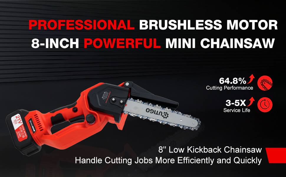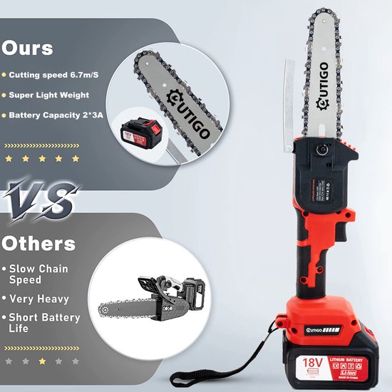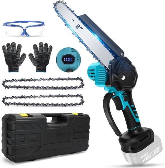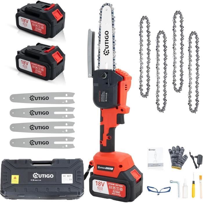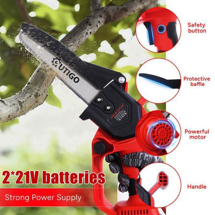 【Entretien facile】Ils sont plus faciles à ranger et leur coût d'entretien est moins élevé. 【Lubrification automatique de la chaîne】Cette tronçonneuse sans fil de 8 pouces est équipée d'un système de lubrification automatique de la chaîne. Puissant moteur de tronçonneuse en cuivre pur] : Cette tronçonneuse sans fil est équipée d'un moteur sans balais haute performance de 800 W qui prolonge sa durée de vie de 90 %, augmente son rendement de 80 % et réduit sa consommation d'énergie de 50 À propos de cet article [Coupe efficace]Notre mini tronçonneuse sans fil OUTIGO est équipée d'un moteur avancé et la chaîne est fabriquée en acier au manganèse trempé de haute qualité. Excellente performance. Elle fonctionne plus rapidement, de manière plus stable et plus silencieuse que les tronçonneuses traditionnelles. Il ne faut que 8 secondes pour couper une branche de 8... Il suffit de poncer la chaîne à temps et d'appliquer une bouteille de lubrifiant pour guide pour que la tronçonneuse fonctionne généralement correctement pendant des années. Motosega mini a doppia batteria elettrosega per potatura taglia rami con valigia 【Complete Accessories】Nous avons préparé un kit d'outils portable, 4 chaînes (1 installée), 3 lames de scie (1 installée), 1 manuel, 1 chargeur, 1 paire de gants, 1 paire de lunettes, une bouteille d'huile vide, 1 tournevis. Le kit mini tronçonneuse contient tout ce dont vous avez besoin. Mini Tronconneuse A Batterie OUTIGO Tronçonneuse à Batterie 8 Pouces Sans Fil Review: Le Tronçonneuse Lubrification Automatique Il suffit de verser de l'huile de moteur ordinaire dans le réservoir d'huile, vous pouvez lubrifier manuellement et automatiquement la chaîne, réduire la résistance à la friction de la chaîne lors de l'utilisation de la scie à chaîne, et obtenir une coupe en douceur. Elle fonctionne plus rapidement, de manière plus stable et plus silencieuse que les tronçonneuses traditionnelles. Il ne faut que 8 secondes pour couper une branche de 8 pouces d'épaisseur !
