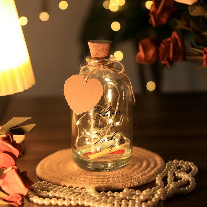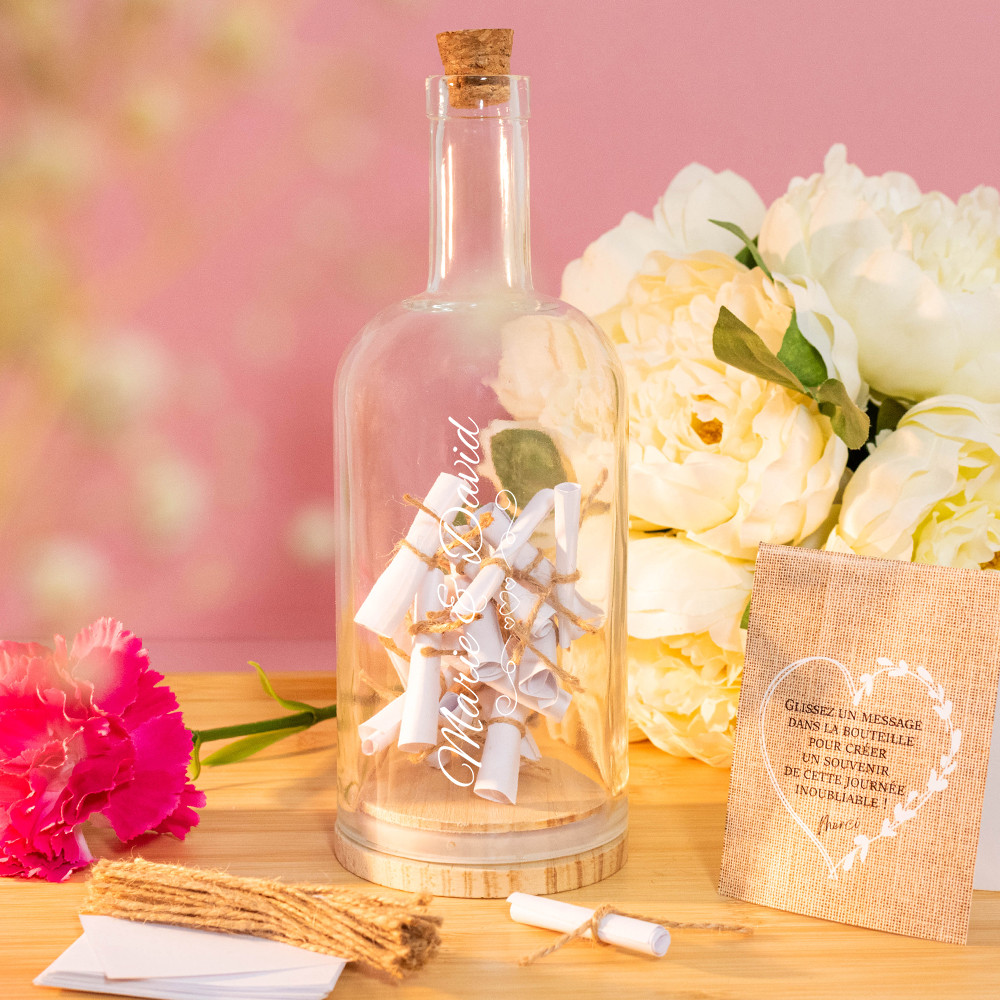 【Cadeau symbolique et mémorable】Cette bouteille lumière mariage avec fleurs séchées allie symbolique et design, Elle est idéale pour un cadeau mariage personnalisé, une boite cadeau mariage ou une bouteille lumineuse LED de mariage et rend vos Cadeaux de mariage pour couple de mariés encore plus inoubliables Étiquette personnalisable pour bouteille vin ou de champagne - Cuvée Ensemble de mariage romantique pour les mariés : comprend une bouteille avec l'inscription « Just Married », un bouquet de fleurs, une guirlande lumineuse LED, un pendentif en forme de cœur et une ficelle, idéal comme cadeau 【Ambiance romantique avec lumière LED】La combinaison de fleurs séchées et de LED crée une lumière douce et chaleureuse, Cette bouteille lumière mariage avec fleurs séchées transforme chaque cadeau mariage personnalisé en pièce maîtresse et offre des idées uniques de Cadeaux de mariage pour couple de mariés 【Matériaux de qualité et design durable】La bouteille en verre avec couvercle en bois et joint en silicone est robuste et réutilisable, Elle convient parfaitement comme bouteille lumineuse LED de mariage pour présenter vos Cadeaux de mariage pour couple de mariés ou comme boite cadeau mariage décorative et originale LEMROE Lumière de bouteille,12 pièces 20 LED 2M lumières de bouteille... 【Bouteille décorative et tirelire pratique】Cette bouteille lumineuse LED de mariage est parfaite comme boite cadeau mariage et peut ensuite décorer un salon ou une chambre, Elle permet de présenter des Cadeaux de mariage pour couple de mariés de manière élégante tout en gardant un souvenir précieux de leur journée spéciale En raison des différentes conditions d'éclairage lors de la prise de photos et de la luminosité de chaque écran d'ordinateur, la compréhension des couleurs est différente et il peut y avoir de légères différences de couleur. Bouteille Lumière Mariage Cadeaux De Mariage Pour Couple De Mariés, Cadeau De Mariage, Lot De 2 Bouteille Lumineuse LED Mariage