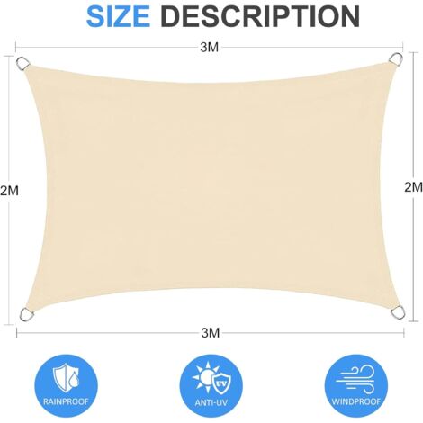 Vous pourrez ainsi apporter une touche de couleur et de gaieté supplémentaire à votre jardin. Blocage UV ]: Protection UV - Bloquant des rayons UV, l'auvent est conçu pour fournir une protection solaire et est idéal pour une utilisation en extérieur, comme les terrasses ou les jardins De quoi se constituer un véritable petit coin ombragé très apprécié de tous par temps ensoleillé et chaud. 🌧️Imperméable et durable : Le tissu est doté d'un revêtement imperméable et le liquide s'écoule en gouttes. 🌿 Utilisations : les voiles d'ombrage sont utilisées pour les balcons, jardins, terrasses, pelouses, piscines, parcs, pergolas, aires de jeux pour enfants, aires de barbecue ou autres terrasses. Toile Ombrage Extérieure Imperméable Voile D'ombrage Imperméable Rectangulaire 2.5 X 3m Toile Ombrage 95 Une Protection Des Rayons Uv Pour Exterieur Terrasse Jardin Balcon Beige 87913711 Voile D'ombrage Motif Rayures Rouges Sur le tissu imperméable, le liquide roule à la surface sous forme de perles d'eau protection contre les UV Facile d’installation INSTRUCTIONS D'INSTALLATION: 1., Mesurer la zone d'installation de la voile d'ombrage., 2., Laissez un espace de 0,5 m entre le point de fixation et la voiled'ombrage., 3., Suggests that the installation angle is 20-40 degrees, to achieve maximum tension and also to allow rain to run off. 🛠️Installation facile et accessoires inclus :Le Voile d'ombrage avec œillets aux quatre coins et de 4 cordes en nylon renforcées, faciles à fixer au mur, à un arbre ou à un support. Veuillez incliner le store à un angle de 20 à 40 °. 🌞Protection solaire et UV : Son revêtement imperméable et son tissu en polyester épais bloquent efficacement les rayons UV et protègent la peau et les meubles de jardin des dommages causés par le soleil. Voile d'ombrage Voile Ombrage Rectangulaire 2x3m Auvent Toile Ombrage 🌈Impression 3D : Le voile d'ombrage utilise une technologie d'impression 3D de haute précision, avec des couleurs vives et résistantes à la décoloration, ajoutant une touche d'art moderne à votre jardin ou terrasse (mandala, motifs géométriques, végétaux et autres motifs en option). VINGVO Toile d'ombrage épaissie avec œillet UV imperméable à l'eau pour...
