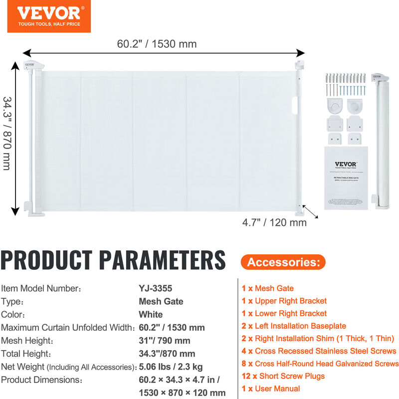 Barrière de sécurité rétractable : le gardien de la sécurité de votre famille La conception unique de la bande inférieure anti-rampement offre une protection supplémentaire, empêchant les animaux de passer facilement par en dessous. 1 x Ensemble de crochets de sol et d'accessoires Utilisation facile d'une seule main : Notre barrière rétractable s'ouvre en un seul geste, sans avoir besoin des deux mains ni d'une étape supplémentaire. Spécification Numéro de modèle de l'article : SH20., 006BB-140CD, Couleur : Noir Achetez Fournitures pour Animaux de Compagnie en ligne | FR 4 x plaques inférieures, 1 x curseur Pas de basculement, pas de glissement : une barrière de sécurité stable et fiable. De plus, elle est résistante aux rayures, de sorte que même si les animaux tentent de la griffer, elle reste comme neuve. Conception rétractable : Cette barrière en maille noire peut s'étendre jusqu'à 140 cm de large et 87 cm de haut, ce qui vous permet d'ajuster l'ouverture selon vos besoins. Large application Notre barrière rétractable convient à divers espaces, notamment les salles de jeux, les cuisines, les couloirs, les escaliers et les chambres. Piquets de sol pour plus de stabilité Des ancrages au sol sécurisés maintiennent la barrière fermement en place, même lorsque les animaux la poussent ou sautent. 4 x autocollants de position Conception en maille sécurisée : Le matériau en maille est doux et délicat, offrant une meilleure protection contre les collisions accidentelles pour les animaux. Son ouverture en une seule étape permet une utilisation sans effort d'une seule main, un véritable confort pour les parents pressés. VEVOR Barriere De Securite Extensible Jusqu'a 295 Cm Hauteur 87 Cm Barriere Retractable Pour Bebes Ouverture Dune Seule Main Clotures En Mailles Pour Enfants Chiens Chats Couloir Escalier Salon Gris 81490039 1 x tuyau en fer droit Cadre en fibre de verre renforcé Conçue pour gérer les animaux de compagnie énergiques, la structure en fibre de verre renforcée résiste à la flexion et à la rupture, offrant une durabilité durable sur laquelle vous pouvez compter. Installation réglable : Les connecteurs d'installation sont réglables vers le haut et vers le bas, ce qui permet de minimiser les espaces en bas lors de l'installation dans des zones avec plinthes. Notre barrière rétractable s'installe dans différents endroits de votre maison, comme les salles de jeux, les cuisines, les couloirs, les escaliers, les chambres, etc 10 x jeux de vis plates à tête cruciforme (avec capuchons en caoutchouc) De plus, notre barrière en maille est dotée d'une structure robuste, résistante aux rayures et durable, qui résiste efficacement aux impacts et aux griffures des animaux Nos barrières rétractables sont équipées d'une bande inférieure anti-ramper spéciale, empêchant de se faufiler facilement et réduisant les risques de blessures dues aux ouvertures situées en bas Structure à haute résistance Sa structure en maille technique assure une résistance et une durabilité exceptionnelles, capable de résister aux jeux des animaux. Achetez Barrière de Sécurité Extensible pour Chiens 140x87 cm Escalier Porte Noir au prix le plus bas, livraison en 2 jours, retour sous 30 jours. Achetez maintenant chez 1 x base inférieure droite Notre barrière rétractable pour bébés convient à différents espaces, notamment les salles de jeux, les cuisines, les couloirs, les escaliers et les chambres à coucher. Elle constitue une zone d'activité sûre pour les animaux domestiques et les enfants