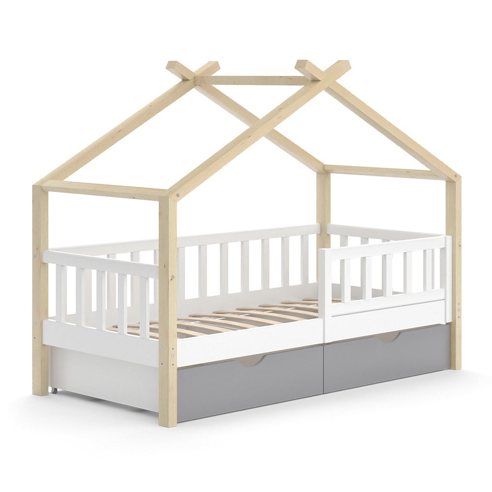 Lit Sol Lit Cabane 140x200 Cm - Avec Barrière Et Rangement - Pin Massif Blanc Lit Montessori Enfant 140x200 Lit Au Sol Conception pensée pour la sécurité : Les protections latérales et la porte du lit ont été conçues pour offrir un sommeil protégé à l’enfant. Le lit cabane permet de créer un espace de sommeil ludique et imaginatif pour votre enfant. Inspiré des cabanes en bois et des maisons dans les arbres, ce véritable espace de jeu créatif est une version sécurisée à intégrer dans une chambre Quels types de lit cabane avec barrière choisir pour votre enfant En cas de problème ou de question, veuillez nous contacter immédiatement. Deux options de couleur disponibles : Ce lit au sol enfant est proposé en blanc ou en gris, deux couleurs neutres qui s’intègrent facilement dans différents styles de décoration. Lit cabane Pugsdrly pour enfant en forme de maison 140 x 200 cm en bois de pin blanc Une petite porte latérale, qui peut s’ouvrir et se fermer, rend le lit plus interactif tout en assurant un espace de sommeil sûr et confortable. Fabriqué en pin massif, il offre une grande sécurité grâce à ses protections latérales et son sommier robuste. Informations sur le produit : Couleur principale :Blanc/Gris Matériau principal :contreplaqué + MDF + bois de pin Style du produit : moderne Type de produit :lit enfant Pays d'origine : Chine Capacité de charge maximale: 120kg(90x200)/150 kg(140x200) Taille du produit : 90x200cm lit (B x T x H) :235 x 111., 8 x 115cm 29kg 140x200cm lit (B x T x H) :235 x 145 x 115cm 38kg Convient à la taille du matelas: 90x200cm/140x200cm Épaisseur de matelas recommandée : 8-12 cm Remarque : ✅Toutes les dimensions sont approximatives,Des erreurs de 2 à 3 cm peuvent se produire. Veuillez faire preuve de patience et vérifier que tous les accessoires sont complets avant de procéder au montage. ✅Ce produit ne comprend pas de matelas ✅Nos produits sont accompagnés d'instructions de montage claires afin d'assurer un assemblage rapide et facile. Tête de lit avec rangement intégré : La tête de lit en bois massif comprend des étagères et des compartiments pratiques, permettant de garder à portée de main les objets essentiels comme les livres ou les petits jouets. Un design amusant et attrayant qui apporte une touche d'originalité et de créativité à la chambre de votre enfant. Disponible en blanc ou gris, il s’adapte facilement à tous les styles de chambres tout en apportant un espace de sommeil confortable et amusant.