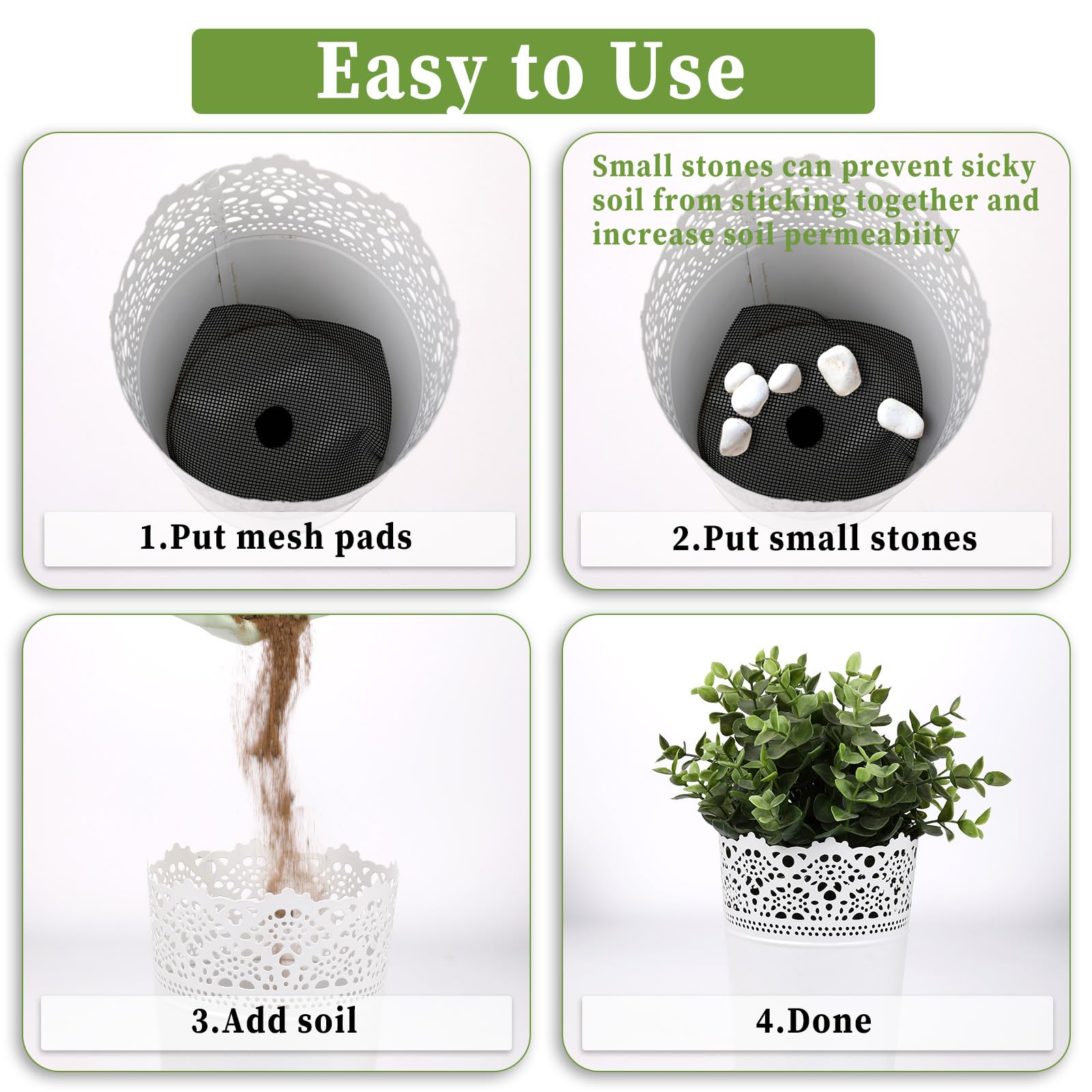 Coussinets en maille pour trous de Pot de fleur, 100 pièces, tapis de grille de fond de jardinière en plastique pour le Drainage de rétention du sol, accessoire de Pot de fleurs 120 Pièces Pad Grille De Pot De Fleur, Maille Pad Tapis Trou De Pot De Fleurs De Drainage Respirante Pour Plantes Jardin Outillage De Jardin Bonsai 97578481 Drainage efficace : le tapis en maille facilite l'évacuation optimale de l'eau de vos pots de fleurs, évitant la sursaturation et protégeant les racines des plantes de la pourriture, ce qui est essentiel pour une croissance saine Design unique en maille : le design unique en maille maintient la plante respirante, ce qui permet à l'excès d'eau de s'écouler, garde la surface propre et bien rangée, et empêche efficacement la pourriture des racines