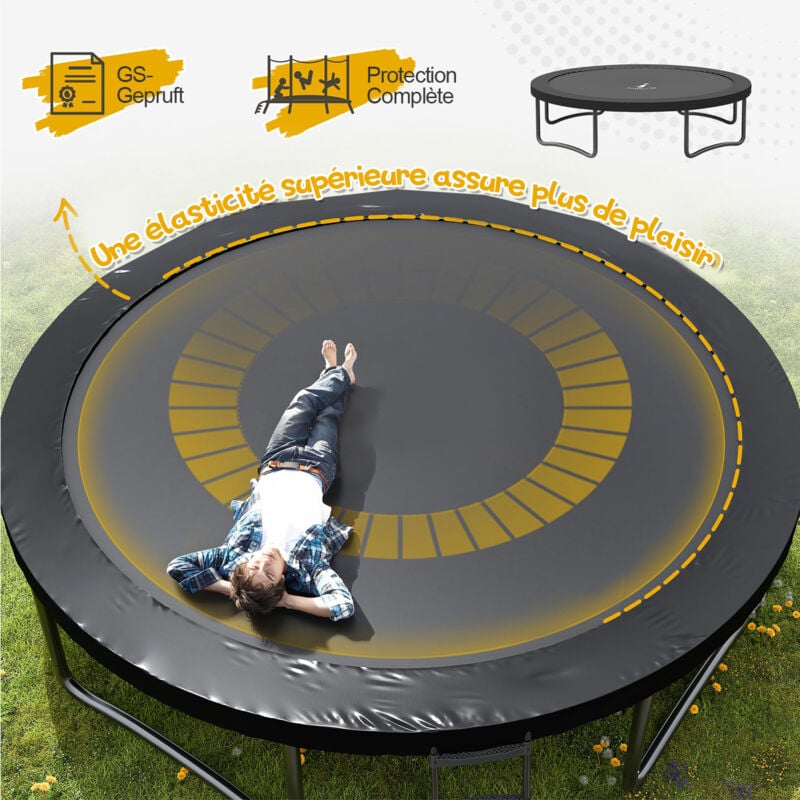 EN STOCK : Trampoline extérieur rond 305cm max. 150kg set complet filet de sécurité porte d'entrée échelle jardin robuste accessoires, 991476 pas cher. Livraison rapide partout en France Le cadre est galvanisé à l'intérieur et à l'extérieur, les pieds sont revêtus de poudre pour une protection supplémentaire contre la rouille et les coussinets en mousse sont imperméables pour que votre nouveau trampoline dure longtemps. Panier Basket Exterieur Trampoline 366 Cm Pour Usage En Plein Air Avec Panier De Basket Et Filet De Protection Adapte Aux Enfants Et Aux Adultes 138094952 Trampoline Sécurité Renforcée Enfants Le trampoline est certifié selon les normes de sécurité mondiales ASTM F381-16 et ASTM F963-17 et est synonyme de sécurité, de durabilité, d'innovation et de plaisir ultimes. 【Engagement transmis de génération en génération pour la qualité et la tranquillité d'esprit】: OVATOYS s'engage à offrir aux familles une expérience de jeu sûre et passionnante en plein air, et insiste sur l'utilisation de matériaux de qualité supérieure pour construire des produits qui garantissent durabilité et fiabilité et accompagnent les familles pendant d'innombrables heures de plaisir. La marque s'engage envers ses employés, clients et communautés et fait de chaque trampoline un produit de qualité qui résistera à l'épreuve du temps. Les enfants vont adorer ce trampoline Redkid de 305cm de diamètre ! La sécurité est maximale avec le filet de protection haute qualité et les tapis épais... Trampoline Enfant 305cm Avec Filet De Protection, Trampoline De Protection Trampoline De Jardin En Forme Fleur Avec Certification Gs Coussin De Securite Cadre En Metal Galvanise Interieur Exterieur Le ressort et le cadre sont tous recouverts de coussinets de protection, et la barre de support extérieure est enveloppée de mousse haute densité pour renforcer davantage le tampon d'impact et protéger la sécurité du saut sous tous les aspects. Équipé de ressorts d'extension à haute tension, le modèle 10FT contient 64 ressorts de haute qualité qui offrent une sensation de douceur profonde et une forte flottabilité pour une excellente expérience de saut, peu importe où vous sautez. Protection de sécurité complète à 360 °, pas d'angle mort : le tapis de saut est étroitement lié au tapis de saut, sans espaces où les mains et les pieds pourraient rester coincés, formant ainsi un espace de saut entièrement fermé qui empêche efficacement les chutes et réduit le risque de pincement.