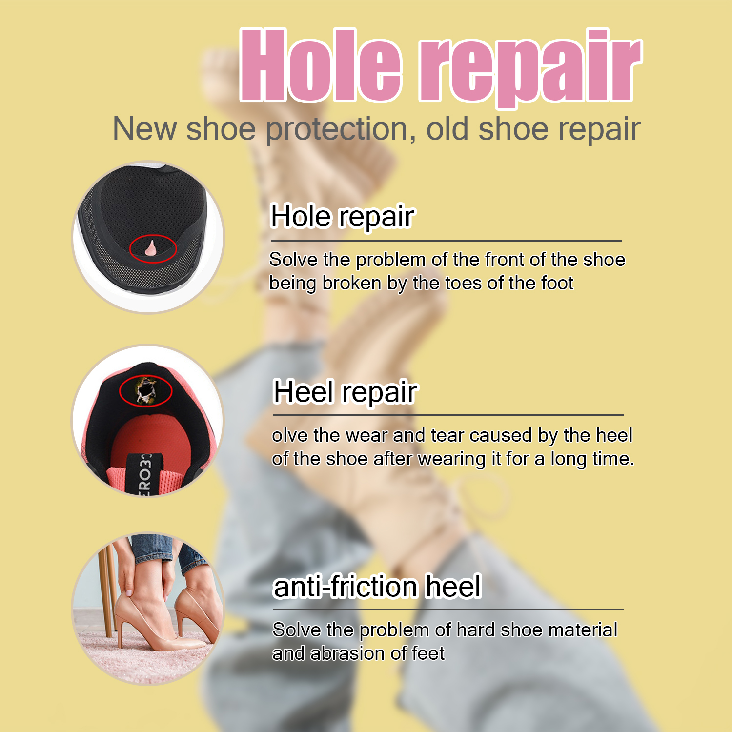 Garantissent une réparation immédiate et fiable de vos chaussures durant les voyages ou loisirs en extérieur, quelle que soit la situation. Prolongation durable : Adhésifs ronds s'adaptant aux courbures des chaussures pour un ajustement précis, recouvrant les parties abîmées et retardant efficacement les dommages futurs. Patchs de réparation de chaussures, 6 pièces, blanc L'autocollant auto-adhésif de réparation de chaussures est conçu avec auto-adhésif sur le dos. Il n'est pas nécessaire d'utiliser de la colle Facilité d'utilisation à tout moment. Patchs de réparation de chaussures, autocollants de Mise en œuvre aisée: Réalisez des réparations efficaces de chaussures avec des patchs prêts-à-coller; nécessite la préparation des surfaces et une simple pression lors de l'application, sans aucun outil supplémentaire pour boucher les trous. Longévité garantie : Le matériau composite flexible des patchs confère des propriétés anti-usure, préservant leur intégrité lors d'utilisations prolongées sans altération des performances techniques. s Autocollant KIMISS Patchs Pour Boutons 72 Pièces Patchs De Boutons De Taches Couvrent Les Imperfections Patch Réparation Chaussure Pratique : Conçu pour une utilisation nomade, ces patchs adhésifs légers s'emportent partout sans effort. Spécification:Matériel: cuir PU microfibreCouleur: blanc, noir, gris, gris foncé, bleu marine, bleuTaille du produit: Petit environ 3 cm / 1,18 poucesMoyen d'environ 4 cm / 1,57 poucesGrand environ 4x5 cm / 1,57x1,97 poucesStyle: rétro, simpleUtilisation: chaussures de sport, chaussures en tissu, chaussures en cuir, talons hauts, etc. Applications multiples : Conçu pour chaussures décontractées ou élégantes, ce kit de réparation résiste aux conditions extérieures et s'adapte aisément aux environnements quotidiens ou actifs sans compromis.