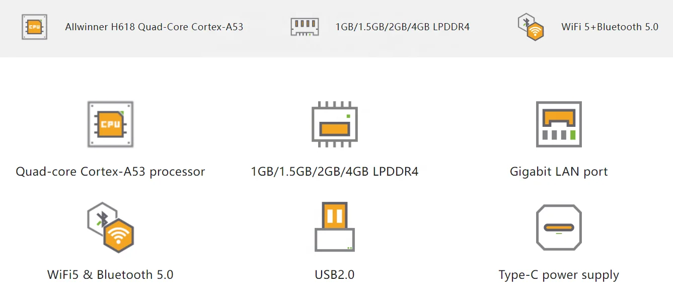 Large gamme d'applications : peut être largement utilisé dans les boîtiers TV, les appareils de moulage à affichage intelligent, la maison intelligente, la passerelle intelligente, l'IoT et d'autres domaines. Design puissant : alimenté par Allwinner-H618 Quad-Core Arm-Cortex-A53 SBC avec mémoire RAM LPDDR4 de 1 Go/1,5 Go/2 Go/4 Go, incorporant un flash SPI plus grand. Prise en charge de la carte d'extension : peut être étendue avec USB2., 0, Ethernet de 100 m, récepteur infrarouge, sortie audio, sortie TV, bouton d'alimentation via interface fonctionnelle à 24 broches avec plaque adaptatrice. Mini PC Processeur Allwinner H618 Pi Zero 2 W Orange Pi Zero 2W Single Board Computer - 1GB LPDDR4 Allwinner H618 Quad-Core Mini Computer Board Raspberry Pi Zero 2 W Design puissant : alimenté par Allwinner-H618 Quad-Core Arm-Cortex-A53 SBC avec mémoire RAM LPDDR4 de 1 Go/1,5 Go/2 Go/4 Go, incorporant un flash SPI plus grand Orange Pi indique que le Pi Zero 2W prend en charge Android 12 TV, Debian 11, Debian 12, Ubuntu 22.04, Ubuntu 20.04 et Orange Pi OS (Arch Orange Pi Zero 2 W 4GB + placa de expansión, placa de darrollo