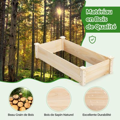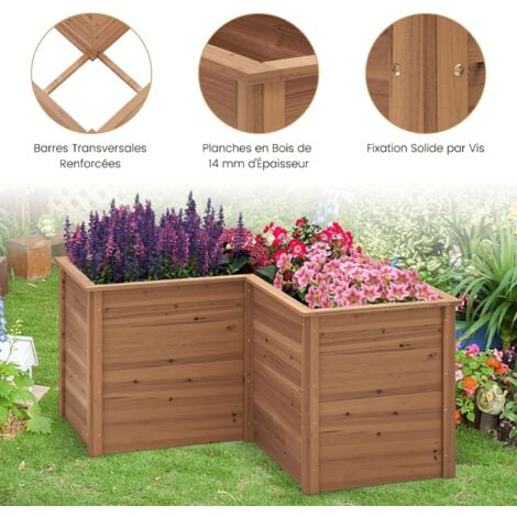 APPLICATIONS MULTIPLES : Cette jardinière peut être utilisée pour créer un mini-jardin à l'extérieur de la maison et peut être facilement intégrée dans des parterres et des jardins pour ajouter beauté et praticité à votre espace extérieur. Carré potager surélevé en Douglas - 120×120 cm, hauteur 40 cm RELAX4LIFE Carré Potager Rectangulaire 120 CM, Jardinière Extérieur en Bois sans Fond, Bac de Plantation pour Fleurs, Légumes, Fruits Cela favorise l'absorption des nutriments par les plantes et offre un espace de croissance sain pour le système racinaire. BASE OUVERTE : Grâce au design à fond ouvert, l'excès d'eau peut facilement s'écouler, évitant ainsi la stagnation de l'eau et la pourriture des racines. Le drainage et une bonne circulation de l'air sont assurés pour une croissance saine des plantes. ★VASTE UTILISATION★La jardinière surélevée d'extérieur vous permet de peindre des couleurs ou des motifs pour créer un paysage unique dans votre espace de vie. Cette jardinière en bois convient au jardin, patio, pelouses,etc ASPECT PERSONNALISABLE : L'aspect naturel du bois confère un charme rustique à ce grand carré potager. Elle répond à tous les besoins de culture et est idéale pour les jardiniers. Carré Potager 120x120 Carré De Potager En Bois - Jardinière D'angle - Dim. 120 X 120 X 62 Cm - Bois Sapin Naturel Bac Plantation Légumes Fleurs