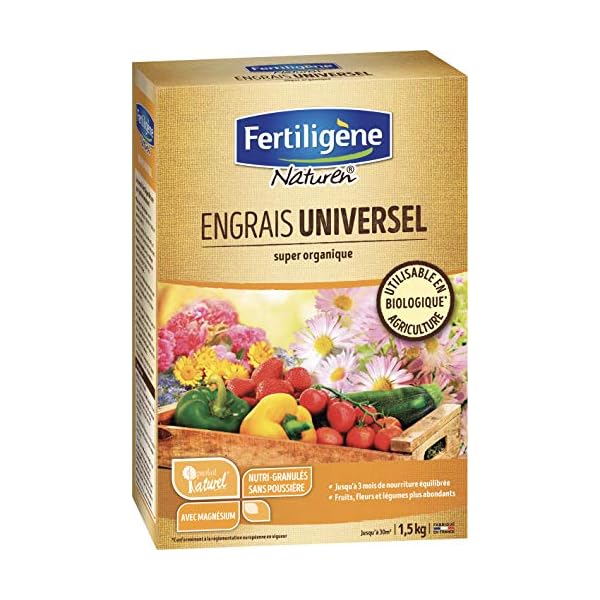 Le flacon pratique avec poignée ergonomique facilite l'application. La formulation favorise une floraison et des récoltes plus abondantes tout en stimulant la croissance. Engrais universel - Fertiligène 700g - Jardi Pradel - Jardinerie et fleuriste à Bagnères-de-Luchon Engrais liquide adapté pour la fertilisation de toutes les plantes. Favorise la croissance des végétaux, la floraison généreuse des fleurs et des récoltes de qualité au potager. 100% d'origine végétale, Utilisable en Agriculture Biologique* et 100 % Vegan, composé uniquement de vinasse de betterave. ENGRAIS NF U 42-011 NK 3.5,2 Une solution complète pour des plantes vigoureuses et productives tout au long de la saison. Engrais mini granulés universel 8 kg+3 kg gratuit | Bricomarché DOSAGE PRATIQUE: S'utilise dilué de mars à septembre, une fois par semaine pour des résultats optimaux VOLUME GÉNÉREUX: Contient 2,5 litres d'engrais concentré à diluer, permettant de nombreuses applications Floraison Abondante Engrais Universel "Performance Organics" 400ml - Fertiligène Engrais Potager Utilisable de mars à septembre, avec un dosage simple : une fois par semaine pour 1L d'eau. Description du produit Découvrez l'engrais universel complet Fertiligène, une solution naturelle efficace pour tous vos végétaux. Idéal pour les plantes d'intérieur et d'extérieur, les plantes vertes, les légumes et fruits du potager.