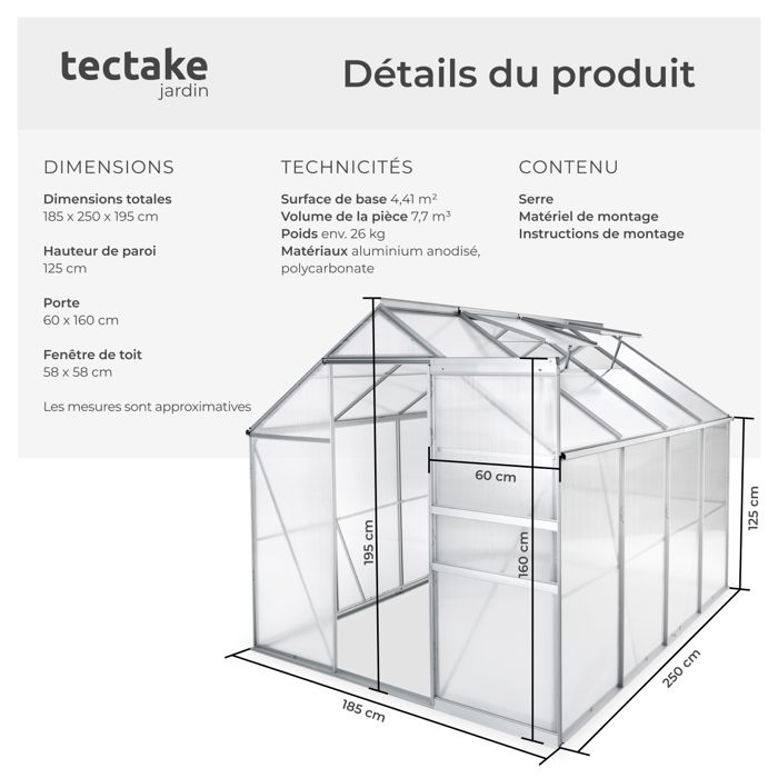 Le montage est particulièrement facile et rapide grâce au système emboîtable. Les plaques alvéolaires transparentes de 4 mm d’épaisseur assurent un éclairage suffisant et protègent vos jeunes pousses contre le vent et les intempéries. Une mini serre parfaite pour préserver vos plantes délicates et votre potager. Avec cette serre de jardin, vos plantes bénéficient d’une protection optimale en hiver comme en été. Points forts : Plaques alvéolaires de 4 mm d’épaisseur Matériaux résistants aux intempéries Les plantes sont protégées contre le vent et les intempéries Système emboîtable pratique Cadre en aluminium de haute qualité Pieds confortables en plastique De bonnes possibilités d’aération Données techniques : Dimensions totales (LxlxH) : 102 x 102 x 41 / 31 cm Poids : 3,5 kg Matériau : Aluminium, plaques alvéolaires, matière plastique Contenu de la livraison : 1 Châssis de couche double Instruction de montage Les livraisons se font en France métropolitaine à l'exception des îles qui ne sont pas reliées au continent par un pont (Corse, Ile d'Yeux etc., ). NOTICE DE MONTAGE Serre de jardin Diamant 146 (8.2m ) base 5cm... Serre de jardin Jasmin 2 | Serres et Jardinieres La serre d’hivernage pour terrasse ou jardin extérieur est fabriquée avec des matériaux résistants aux intempéries, idéale pour prolonger la saison de croissance. Cette serre d’hivernage pour plantes extérieures est conçue pour résister au temps, offrant à vos plantes une maison fiable tout au long de l'année. AÉRATION SIMPLE POUR UN MICROCLIMAT PARFAIT. UNE SOLUTION PARFAITE POUR TOUTES LES SAISONS. Serre D'hivernage Semis Tectake® Mini Serre De Jardin Châssis En Aluminium Plaques Serre Protection Semis Plantes Châssis de Jardin, Mini Serre de Culture, de Jardin en Aluminium et en Plastique TECTAKE. Le châssis de couche vous permet de cultiver vos jeunes plants et vos jeunes pousses même pendant les saisons froides Les livraisons ne se font pas dans les DOM-TOM. Grâce au châssis de couche double, vous pouvez déjà commencer vos cultures pendant les saisons froides. Le cadre en aluminium résistant garantit une durabilité exceptionnelle. Le châssis de couche double de TecTake convient parfaitement pour planter des herbes, des salades et des légumes. Les pieds en plastique empêchent le châssis de s’enfoncer dans la terre. DES MATÉRIAUX PENSÉS POUR LA DURABILITÉ.
