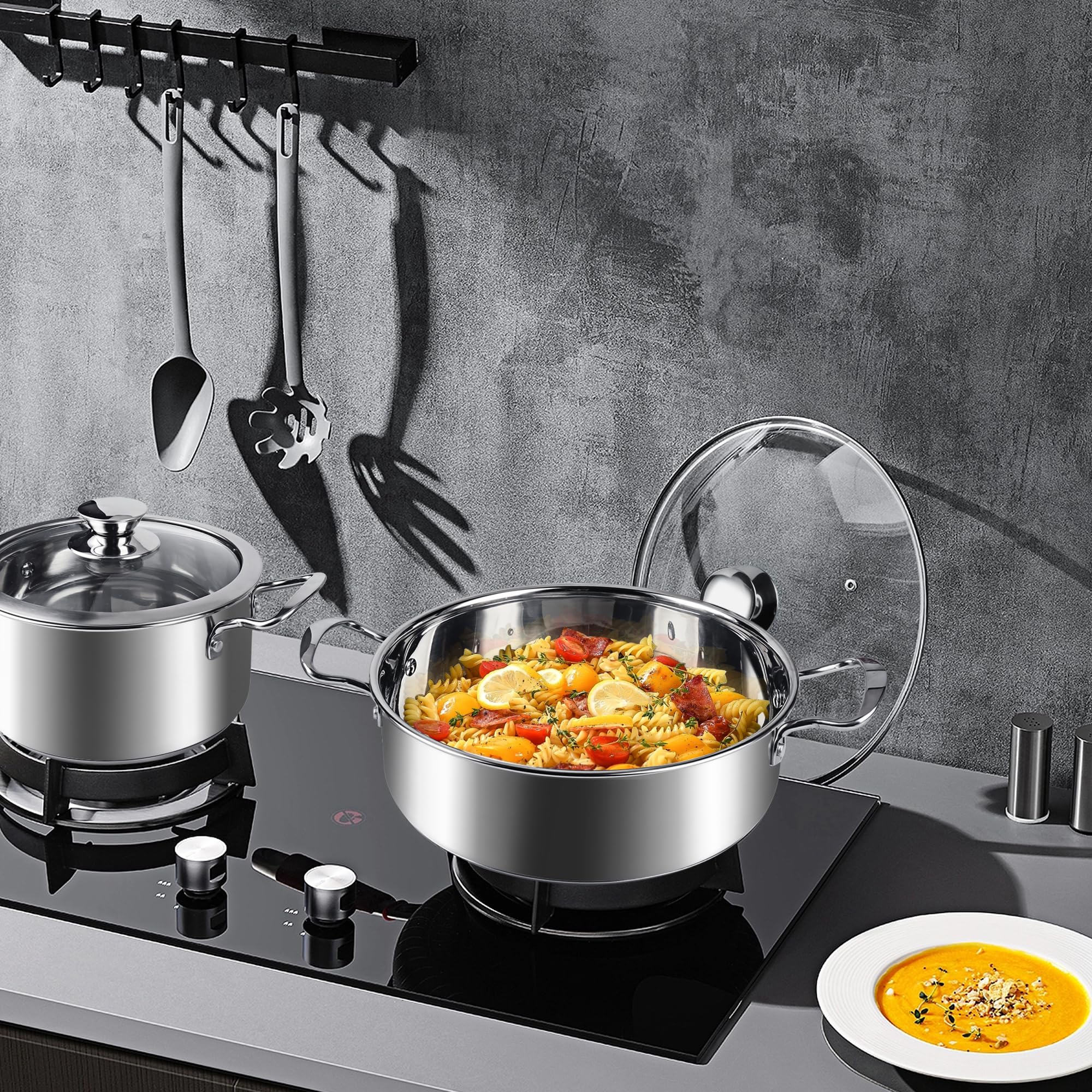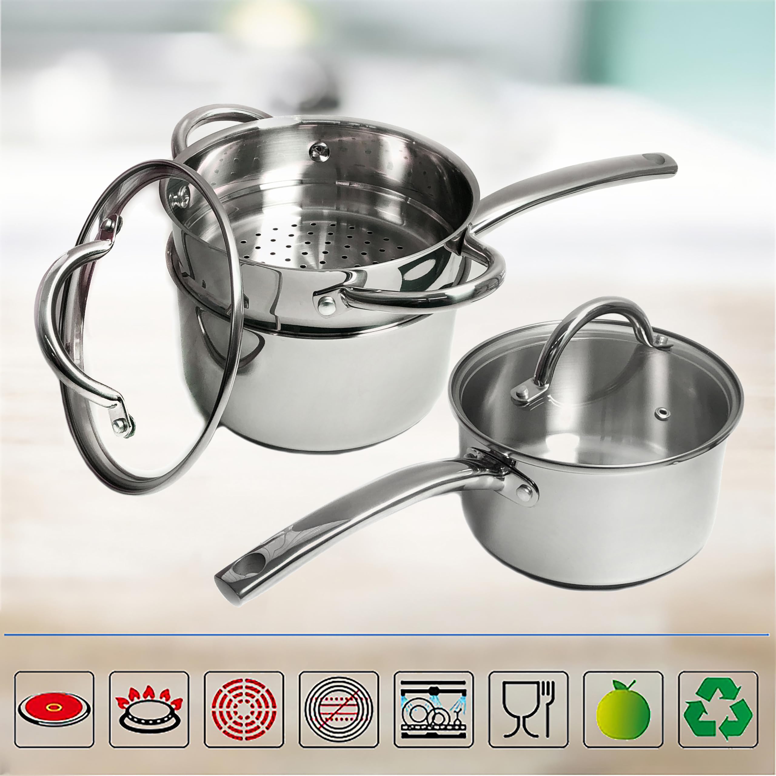 Batterie De Cuisine Induction Lot De Casserole Lot De 6 Casseroles En Acier Inoxydable, Casseroles Avec Couvercles En Verre, Kit De Casseroles Compatibles Avec Plaques à Induction, Gaz Et Marmite Tous Feux MICHELANGELO Lot de 6 casseroles en acier inoxydable avec couvercle et bec verseur - 1 l, 2 l et 3 l - Fond triple épaisseur Lot de casseroles inox Pour équiper votre cuisine avec des ustensiles de qualité, optez pour un lot de casseroles en inox. Résistantes, durables et faciles à entretenir, les casseroles en inox sont idéales pour cuisiner au quotidien Lot de 6 casseroles en acier inoxydable avec couvercles en verre, Lot de 6 casseroles Ensemble de Casseroles et Poêles en Acier Inoxydable, Ensemble de Cuisine 6 Pcs avec Couvercles en Verre, Poignée Qui Reste Froide, Compatible avec Plaques à Induction, Électriques et à Gaz, Non Toxique