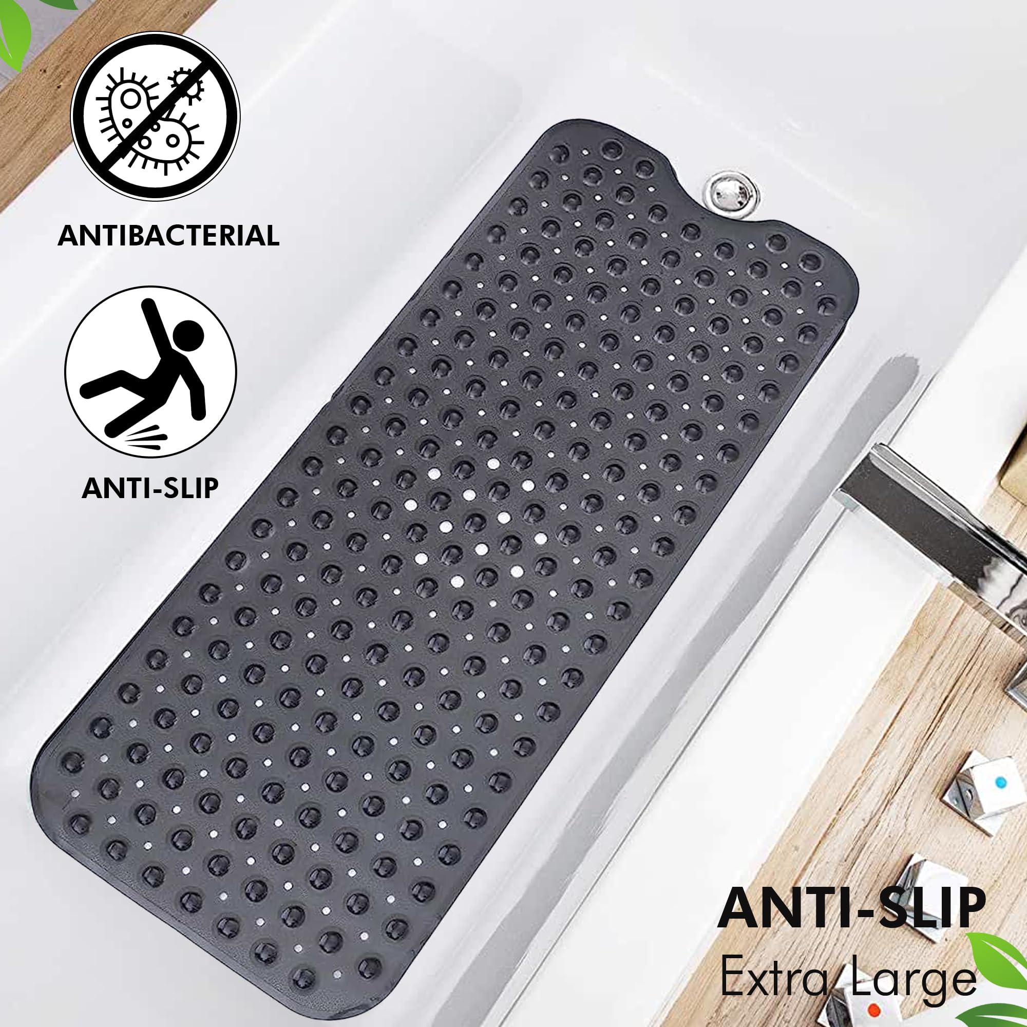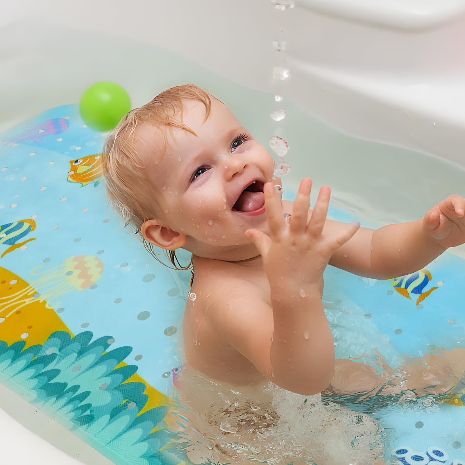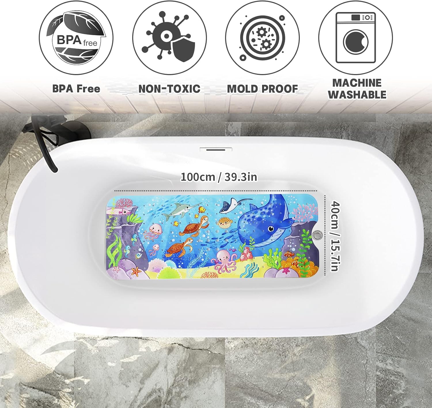 Tapis Drainage JOPHEK Tapis De Douche Antidérapant, Tapis De Baignoire 100x40cm, Avec Trous De Drainage, 200 Ventouse, Résistant à La Moisissure, Antibactérien, Sans BPA,Lavable En Machine, Baleines Tapis De Douche Motif Océan Pour Enfants Il est lavable en machine pour gagner du temps. Tapis de baignoire antidérapant de 100 x 40 cm en PVC non toxique. Conçu pour la sécurité des enfants et des personnes âgées, il est antibactérien et anti... Le tapis de bain antidérapant dispose de petits trous pour permettre à l'eau de circuler et le garder propre. Taille extra large Tapis de bain anti-moisissure : le tapis de bain pour enfants a une surface texturée qui rend la surface rugueuse, empêche les enfants de glisser lorsqu'ils sont assis sur la surface. Convient pour les baignoires incurvées ou rondes enroulables, adapté pour une utilisation dans les salles de bains, les douches, les cuisines et le spa, parfait pour les familles avec des personnes âgées, des femmes enceintes et des enfants à la maison. Tapis De Bain Antidérapant, Extra Long, 100 X 40 Cm Antiderapant Resistant Aux Moisissures Et Lavable En Machine Sans Bpa Transparent 96221276 Tapis de bain durable pour enfant : grand tapis de bain antidérapant Capslpad pour enfants fabriqué en PVC de haute qualité, avec des motifs imprimés de dessins animés sur la surface, pas facile à déformer et à déchirer, résistant à la moisissure, antibactérien, sans latex, sans phtalates, longue durée de vie. Conseils : lorsque vous recevez le tapis de bain, vous pouvez d'abord le nettoyer puis le sécher à l'air libre dans un endroit bien ventilé pendant 1 à 2 jours pour enlever toute odeur du tapis. Ne pas utiliser d'huiles de bain - Peut provoquer un glissement. Tapis de bain antidérapant pour enfants agréable au toucher, tapis de bain antidérapant pour enfants respectueux des tout-petits et des personnes âgées. La taille du tapis de bain antidérapant pour enfants est de 100 x 40 cm, l'excellente couverture dans les baignoires ou les douches vous apporte plus de commodité et de sécurité. Les trous denses du tapis de bain pour enfants permettent à l'eau de circuler rapidement lorsque vous prenez un bain et empêchent efficacement l'accumulation de moisissures, provoquant des odeurs et des chutes. Tapis de bain avec 176 trous de drainage qui accélèrent la circulation de l'eau et de l'air. Ne pas utiliser sur des surfaces texturées, carrelées ou non lisses.