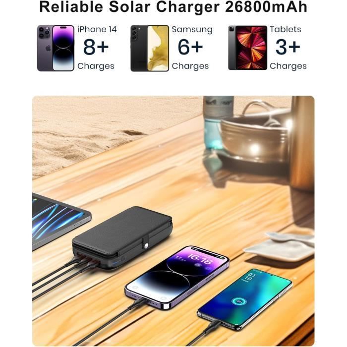 Son écran LED digital affiche le niveau de charge avec une précision de 1%, pour une information claire et fiable., 3., Charge Ultra-rapide: Profitez d'une charge ultra-rapide 22., 5W PD (50% de batterie en 30 minutes via USB-C) et d'une charge sans fil 15W compatible Phone et Android. 1., Innovation Solaire: Cette batterie externe solaire haut de gamme combine innovation et performance avec ses 3 panneaux solaires pliables qui se déplient d'un simple clic grâce au bouton OPEN latéral, offrant une efficacité de charge solaire 6 fois supérieure aux modèles standards. Ses 5 ports polyvalents (2x USB-A, 1x USB-C, 1x Micro-USB, 1x Lighting) permettent de charger plusieurs appareils simultanément., 4., Lampe Tactique 3-en-1: La lampe camping intégrée super lumineuse propose 3 modes intelligents : lumière continue, signal SOS de secours et stroboscope d'alerte, activables simplement par pression courte ou longue. Power Bank Solaire 63200mAh - Charge Sans Fil 15W - 3 Indispensable pour vos activités nocturnes et situations d'urgence., 5., Recharge Tout Temps: Même par temps nuageux (lumière <25., 000 Lux), vous pouvez recharger cette batterie solaire via câble QC 18W (USB-A) ou les entrées Type-C/Micro-USB, avec une charge complète en seulement 6 heures via l'entrée USB-C., 6., Compagnon Outdoor: Cette batterie externe sans fil haute performance est le compagnon ultime pour le camping, la randonnée et toutes vos aventures outdoor ! Capacité énorme de 63200mAh : Batterie Li-Polymer haut de gamme pour une autonomie extrêmement longue Batterie Camping Randonnée 63200mAh Batterie Externe : Solaire Power Bank Sans Fil Avec 3 Panneaux Recharge Solaire Et Câble 5 Ports Achetez Power Banket console de jeux BLULORY|Prix Chez Oxtek