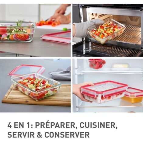 Contenance 0.5L Four Micro-ondes TEFAL - K3010812 - MASTERSEAL Fresh Glass - Boîte Verre De Boîte Alimentaire Rectangle Tefal Sain: le joint et le couvercle sont solidement fixés l'un à l'autre. Idéal pour la préparation des aliments : 100 % compatible au four grâce à son verre borosilicate, résistant aux hautes températures, et utilisable au micro-onde.Transport en toute sécurité : 100 % étanche grâce à la technologie de son joint BOITE RECTANGULAIRE VERRE ROUGE MASTERSEAL Fresh Glass - Boîte verre de conservation alimentaire rectangle Ce produit est également garanti sans BPA et est totalement Compatible au micro-ondes et lave-vaisselle. Pas d'interstice, pas de microbes et garanti sans germes. Boîtes alimentaires et de conservation Masterseal Fresh Tefal Une pression accentuée assure une protection optimale. Description du produit La boîte en verre masterseal fresh rectangle 0., 5L c'est le récipient 4 en 1 qui vous accompagne dans toutes les étapes lorsque vous cuisinez! Le verre de borosilicate est de haute qualité: il résiste mieux aux changements brusques de température et peut être utilisé dans des environnements à haute température comme les fours. Garanti sans germe grâce au joint injecté. La boîte est 100 % étanche grâce au joint innovant. Transport en toute sécurité: 100 % étanche grâce à la technologie de son joint. Idéal pour la préparation des aliments: 100 % compatible au four grâce à son verre borosilicate, résistant aux hautes températures, et utilisable au micro-onde. Elle est 100 % Compatible au four grâce à son verre borosilicate, résiste aux hautes températures et assure une protection optimale contre la décoloration et les odeurs.