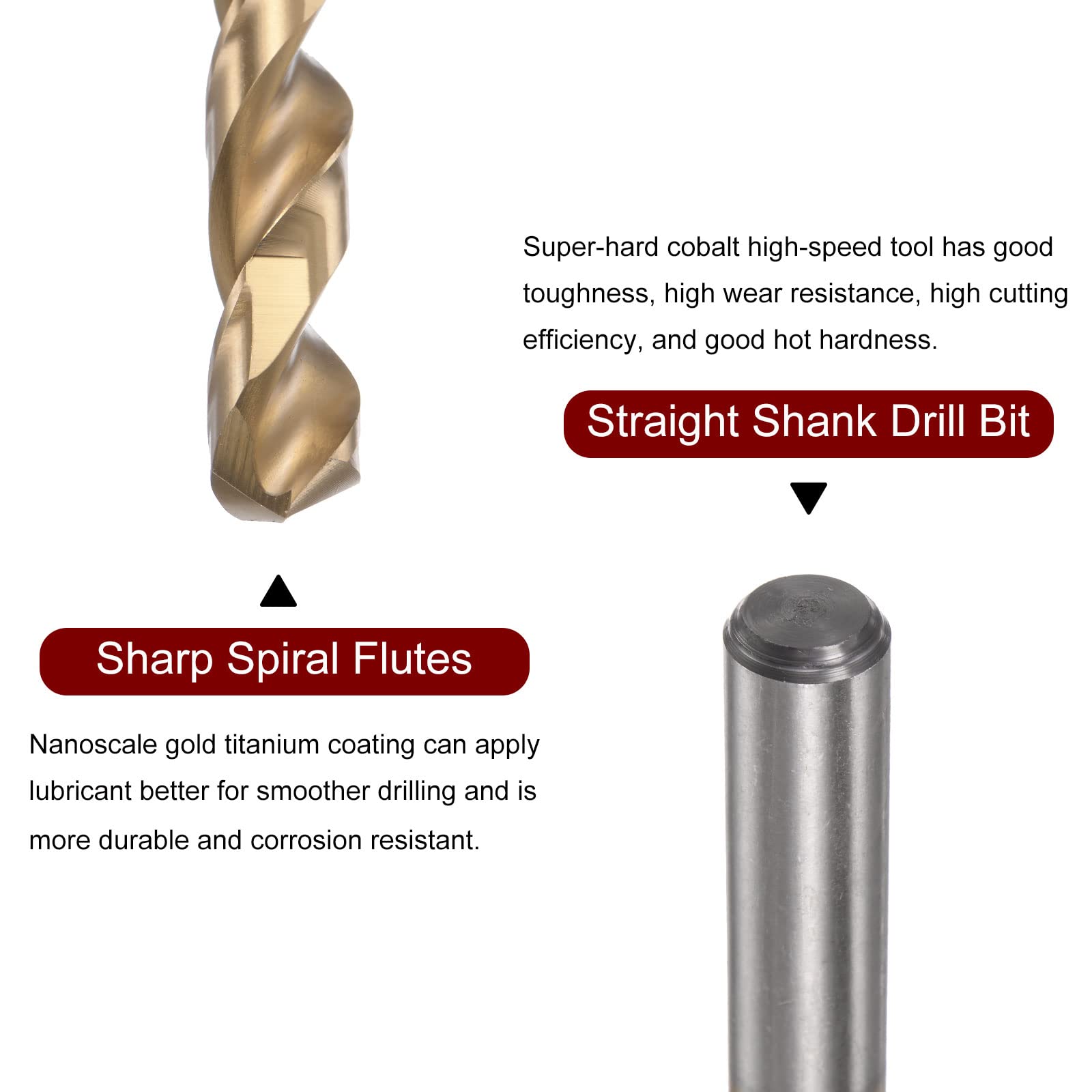 Matériau durable : le foret au cobalt est fabriqué en acier rapide avec du cobalt ajouté, ce qui améliore la dureté élevée, la bonne résistance à l'usure et la stabilité thermique de la perceuse, adapté pour les applications de coupe exigeantes. Matériau durable Dans le processus de perçage, utilisez correctement du liquide de coupe ou de l'huile pour le refroidissement et la lubrification, afin de prolonger la durée de vie de la perceuse. Foret Cobalt 11.8 Mm Sourcingmap Foret Hélicoïdal HSS HSS-Co 11.8 Mm Dia 2 Flûtes Coupe Ronde Tige Droite Noir Foret Longue Durée Vie Caractéristiques : Peut prendre en compte une variété de modèles, perceuse manuelle, perceuse à percussion, perceuse au lithium et perceuse d'établi peut être adapté, efficacement pour les tâches de perçage de précision sur diverses pièces. Matériau durable : le foret au cobalt est fabriqué en acier rapide avec du cobalt ajouté, ce qui améliore la dureté élevée, la bonne résistance à l'usure et la stabilité thermique de la perceuse, adapté pour les applications de coupe exigeantes. Application : le foret hélicoïdal est adapté pour les matériaux durcis et les métaux durs, tels que l'acier inoxydable, l'acier moulé, l'acier allié, la fonte, l'alliage d'aluminium, le cuivre et les plastiques durs, et également adapté pour les matériaux souples comme le bois. L'acier M42 constitue un acier à outils rapide au cobalt super dur contenant 8 % de cobalt, présentant une bonne ténacité, une forte résistance à l'usure, un rendement de coupe élevé et une bonne dureté à chaud ( reste stable même à des températures élevées de coupe des arêtes sourcing map 15pcs Foret hélicoïdal HSS Cobalt Perçage 3,4mm Remarque : utilisez un contrôle approprié de la vitesse, de la pression et de la chaleur lors de l'utilisation de ces forets pour maintenir l'efficacité. Taille : diamètre de fonctionnement : 11,8 mm ; longueur de travail : 77 mm ; diamètre de la tige : 11,8 mm ; longueur totale : 140 mm Applications : le foret Jobber est utilisé pour percer des matériaux durs tels que l'acier inoxydable, l'acier allié, la fonte, l'aluminium, le cuivre, le bois, le fer malléable, l'aluminium, le plastique et d'autres métaux couramment rencontrés dans les applications d'usinage.