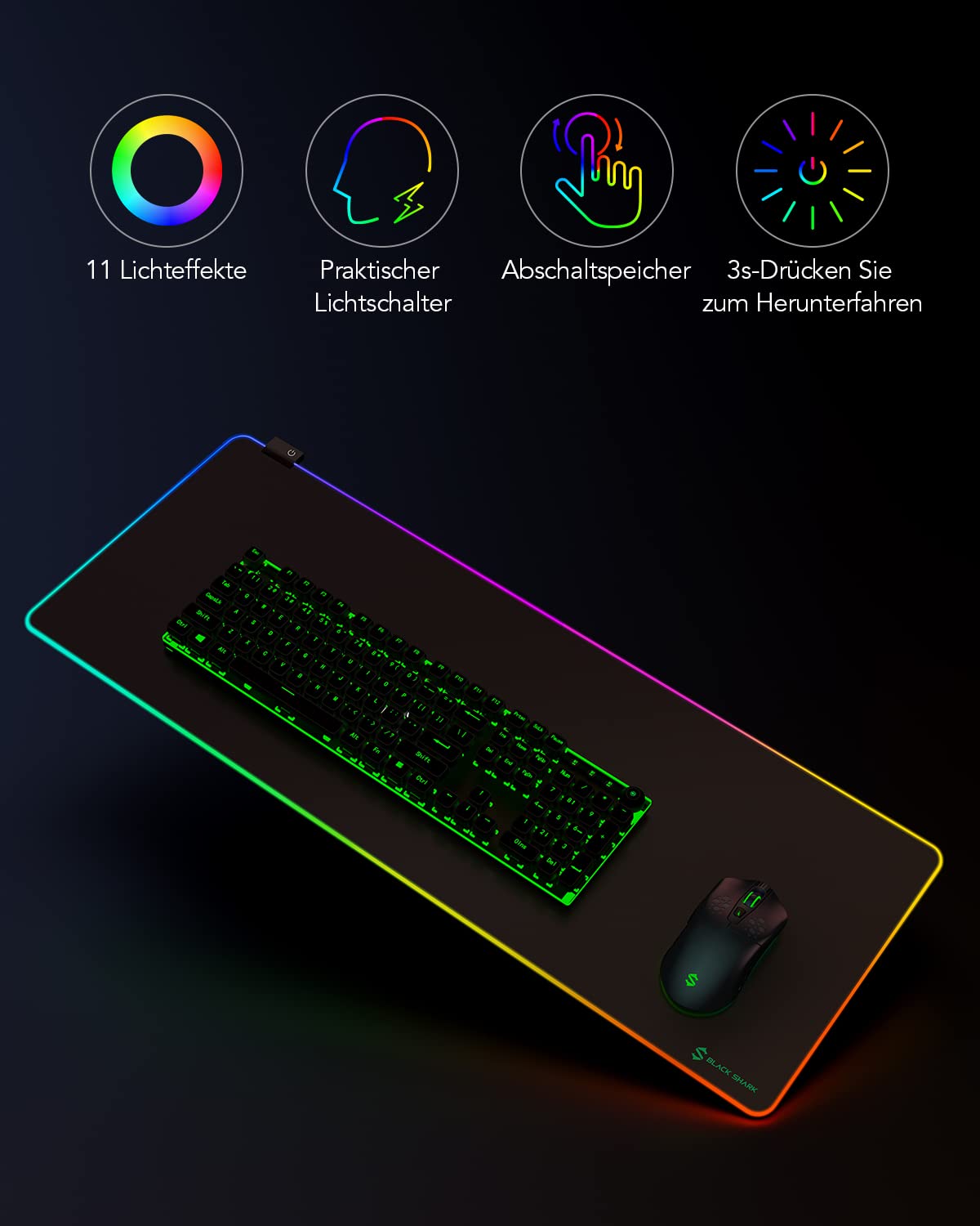 BLACK SHARK MANTA SERIES Série Manta offrent 2 dimensions, peuvent fournir suffisamment d'espace et protéger le poignet. Black Shark Tapis de Souris RGB XXL 900x400 mm, 11 Effets d'éclairage LED, Base antidérapante, Surface Microfibre, Tapis Gaming pour PC Gamer Faits saillants principaux [Surface douce] pour un contrôle précis de la souris ÉCLAIRAGE DE POINTE COMPLET 7 couleurs statiques, des modes de respiration et des modes de roulement, vous pouvez profiter d'un style élégant et de couleurs vives avec un seul bouton. (Remarque : L'odeur émise par le caoutchouc naturel s'estompera après quelques jours d'exposition à la ventilation., ) La surface est également étanche (à l'exception du boîtier de commande), vous n'avez donc pas à vous inquiéter si vous renversez votre boisson dessus [Grande Taille] D'une taille de 800 x 300 x 4 mm / 31,5” x 11,8” x 0,15”, peut recouvrir la zone utilisée de votre tapis souris xxl, vous fournissant ainsi suffisamment d'espace pour déplacer votre souris. [Surface Lisse] Profitez d'un contrôle fluide et précis de votre souris avec ce tapis de souris rgb gaming. Rgb Tapis De Souris Gaming Xxl 120 X 60 Cm, Led Lumineuse Tapis De... Convient à la plupart des souris optiques et laser. Quel tapis de souris RGB choisir pour le gaming en 2025 Tapis Souris Gamer Black Shark RGB Tapis De Souris 800x300x4 Mm, Tapis De Souris Tapis Gaming Imperméable Bords Cousus [Tapis Souris à Rétroéclairage LED] Un simple bouton vous permet de choisir facilement l'un des 11 effets lumineux et la fonction de mémoire hors tension mémorise le dernier mode d'éclairage choisi. BASE ANTIDÉRAPANTE D'ÉPAISSEUR ÉTENDUE Avec une épaisseur de 4 mm (80x30 cm et 90x40 cm), les tapis de souris Manta restent uniformément plats, même sur des surfaces rugueuses, et restent en place sans glisser accidentellement, protégeant également votre poignet lors de travaux et de jeux de longue durée. RÉSISTANCE AUX DÉVERSEMENTS La surface microtexturée empêche les taches et repousse les liquides, elle est facile à nettoyer. BORDS FINEMENT COUSUS Il peut éviter de se décoller grâce à une couture de précision anti-fragmentation à 360°. 1 IMPERMÉABLE 2 ROLLABLE 3 CUTCHÉ 4 DURABLE