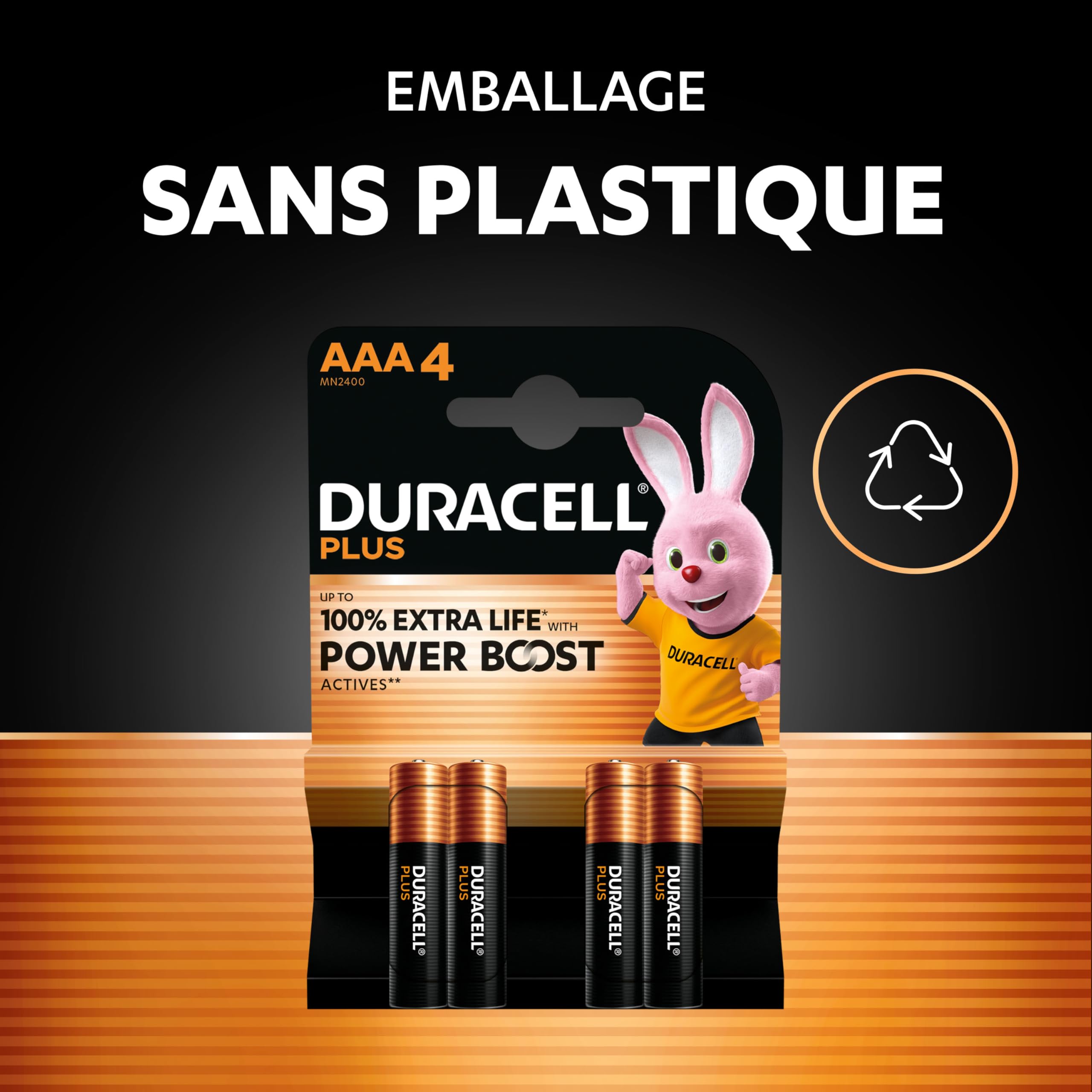 Découvrez nos piles AAA Plus Power pour alimenter vos appareils quotidiens et économiser votre énergie grâce à la technologie Duralock L'emballage peut varier Piles Longue Durée Power Boost DURACELL Plus Piles AAA (Lot De 8) – Piles Alcalines 1,5 V Piles AAA Duracell Plus Lot 8 Elles offrent jusqu’à 100 % de durée de vie supplémentaire* grâce à la technologie brevetée Duracell aux actifs POWER BOOST**, un mélange unique de lithium et de nickel qui offre des performances longue durée pour vos appareils. EMBALLAGE DURABLE: L’emballage des piles contient 0 % de plastique et est recyclable *Longévité par rapport à la durée moyenne minimale du dernier test de l’IEC sur les jouets avec des piles AAA, Les résultats peuvent varier en fonction de l’appareil et de l’utilisation (IEC site web) **Technologie brevetée ***Garantie commerciale Les piles AAA Duracell Plus sont des piles alcalines idéales pour alimenter tous vos appareils courants. La pile AAA Duracell Plus offre jusqu'à 100 % de durée de vie supplémentaire * (*performance de longévité comparée à la durée moyenne minimum du test standard IEC 2015 pour les piles de format AAA sur les appareils photos numériques Duracell Plus, lot de 8 piles alcalines Type AAA 1,5 Volts LR03 Grâce à une durée de conservation garantie jusqu’à 10 ans*** ; vous avez l’assurance que les piles Duracell Plus seront là pour vous fournir de l’énergie qu’il vous faut quand vous en aurez besoin. LA FERMETURE SUPÉRIEURE EN NYLON DE HAUTE QUALITÉ aide à prévenir les fuites de vos piles AAA La fermeture supérieure de haute qualité en nylon contribue à éviter les fuites, et son emballage conçu avec 0 % de plastique est recyclable.