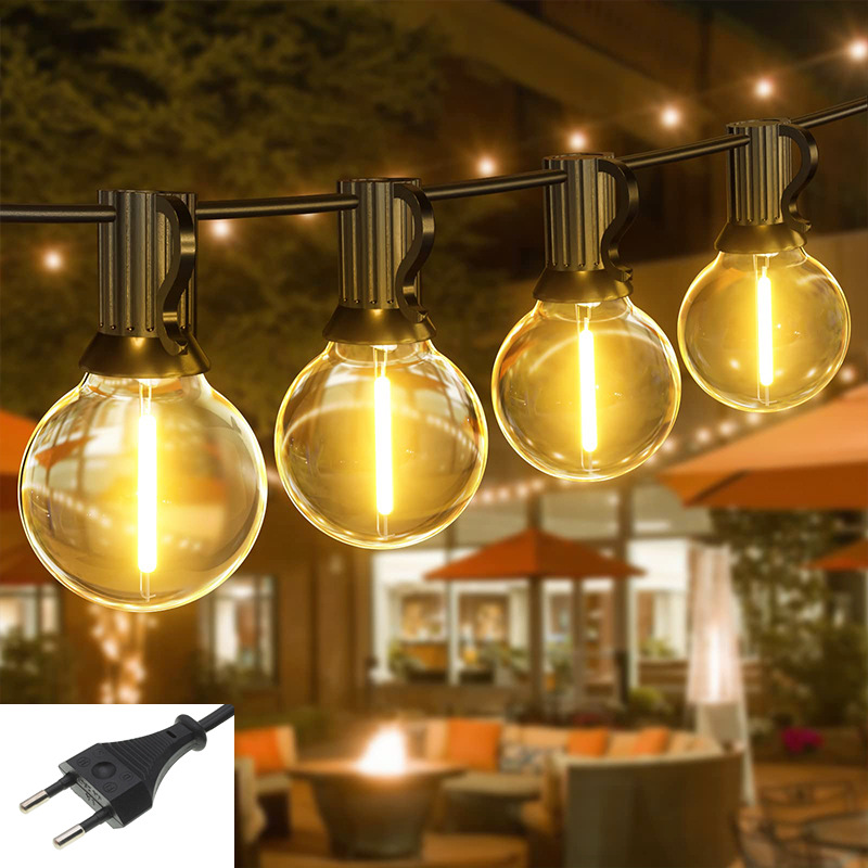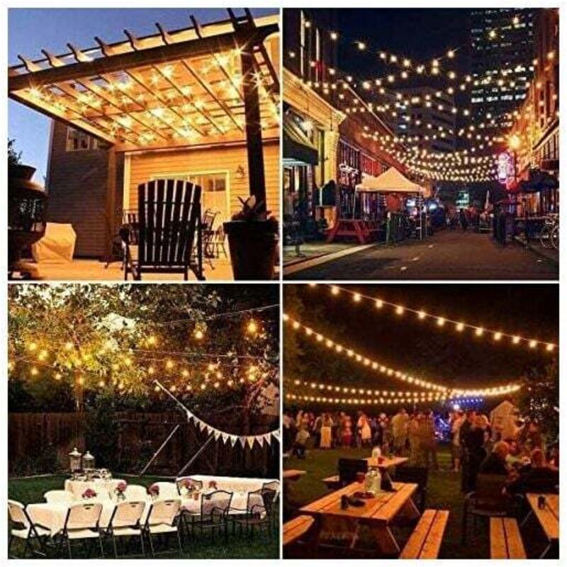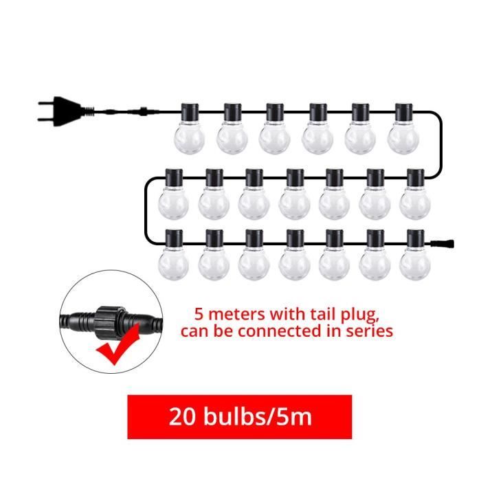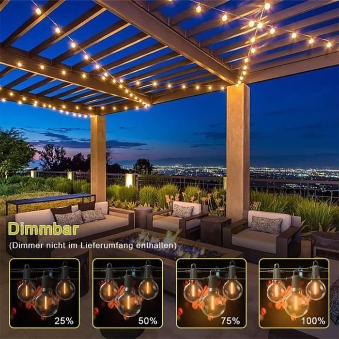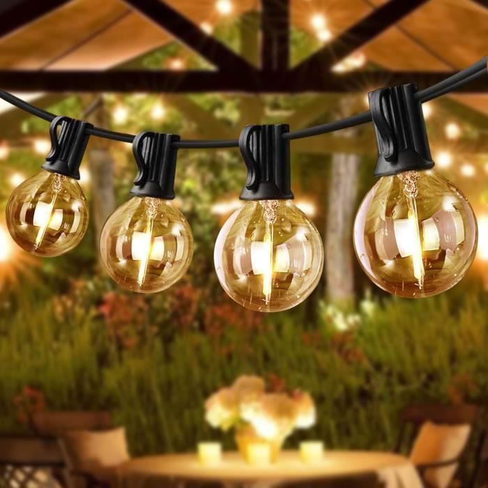 Guirlande lumineuse extérieure 5m Illuminez votre jardin ou votre terrasse avec une guirlande lumineuse extérieure de 5m. Que ce soit pour une soirée festive ou pour créer une ambiance chaleureuse, les guirlandes lumineuses sont un accessoire incontournable pour sublimer votre espace extérieur Avec une étanchéité IP44, ces guirlandes résistent aux étés torrides, aux hivers froids, au soleil, au vent, à la pluie, à la neige et à l'humidité, idéales pour un usage intérieur et extérieur. Guirlande lumineuse d'extérieur étanche, 30,5 m avec 62 ampoules LED incassables à intensité variable, homologation UL, globe G40 1 W 2700 K, éclairage extérieur pour jardin, porche, café, fête, mariage La longueur du câble entre la prise et la première ampoule est de 0,5 m, avec un espacement de 0,91 m entre les ampoules. Parfaites pour les terrasses, porches, jardins, pergolas, cafés, restaurants, mariages, barbecues ou banquets. C'est aussi simple que ça. EN STOCK : Guirlande lumineuse 5m pas cher. Grand choix, promos permanentes et livraison rapide partout en France. Paiement sécurisé Guirlandes guinguettes pour jardin 【Étanches et durables】 : Les guirlandes lumineuses extérieures sont dotées d'un boîtier en plastique dur PC, incassable, résistant et durable, protégeant le circuit contre les dommages. 【Large gamme d'utilisations】 : Ces guirlandes apportent une douce lueur jaunâtre à tout environnement, intérieur ou extérieur, et créent une ambiance chaleureuse. Les ampoules LED G40 s'allument individuellement, et la défaillance d'une ampoule n'affecte pas le fonctionnement normal des autres, créant une atmosphère chaleureuse et romantique.
